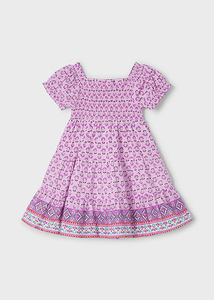 Abitino estivo MAYORAL, modello con scollo quadro e mezza manica. Corpino arricciato e gonna a tripla balza. Color base malva con fantasia floreale.