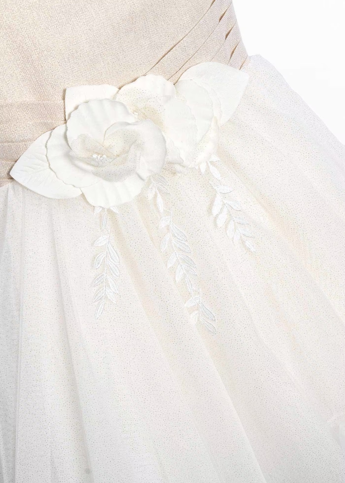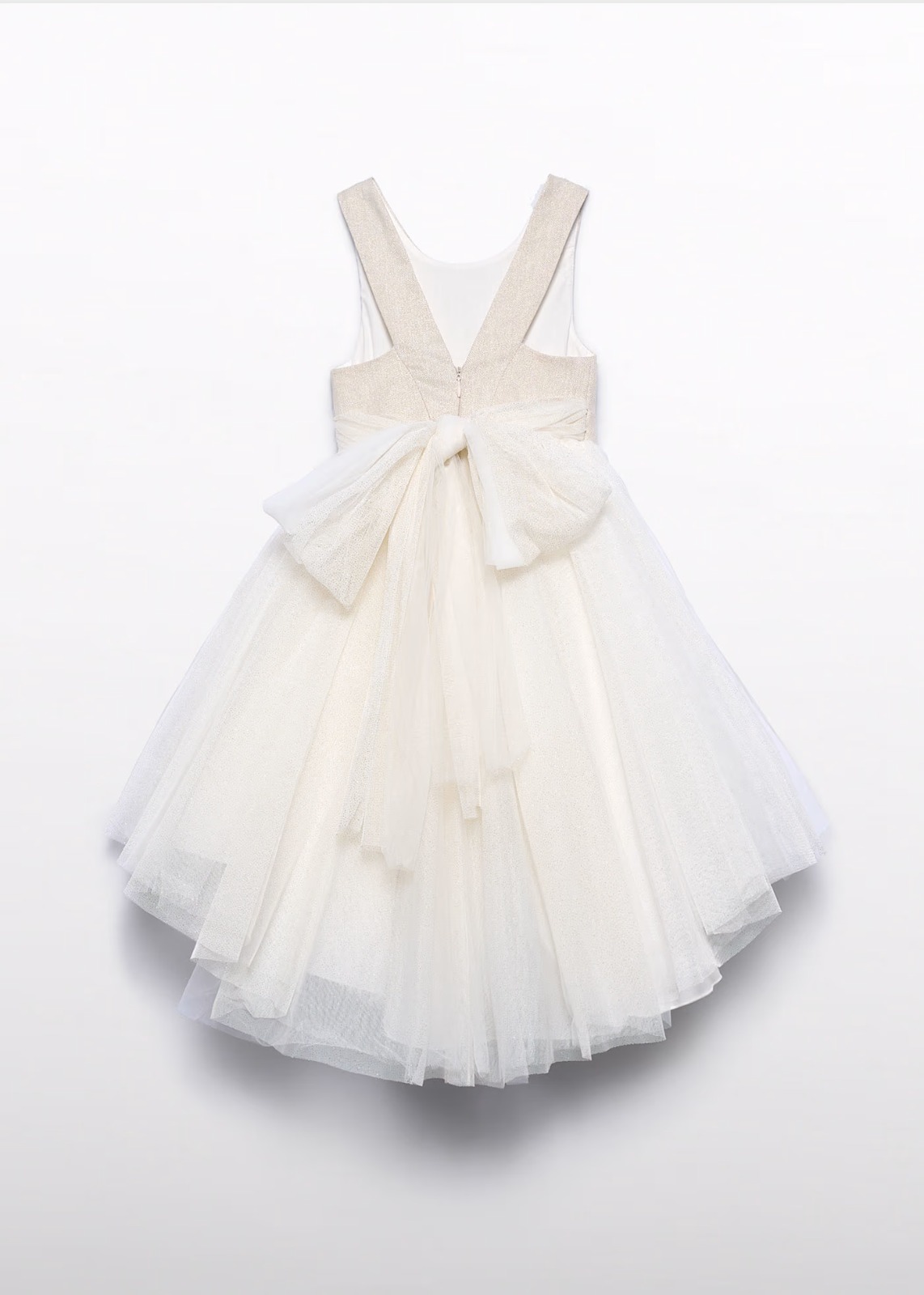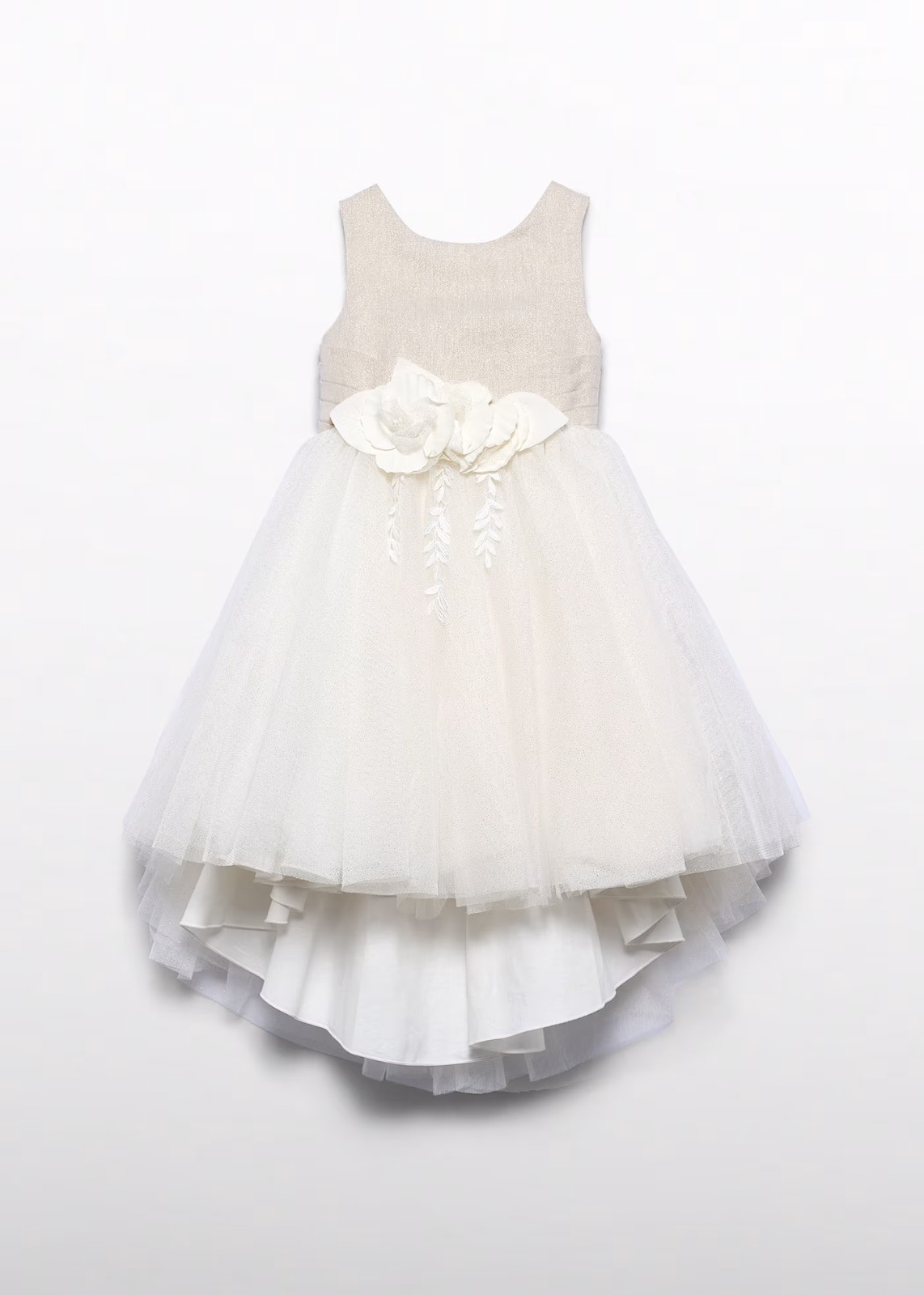 Particolare abito alta cerimonia di ABEL & LULAย con corpino in lino dorato e con glitter e una voluminosa gonna in tulle color avorio con glitter dorati. La gonna รจ asimmetrica, con la parte piรน lunga sul retro. Si chiude con cerniera posteriore, dove si trova anche il fiocco in vita sempre realizzato in tulle. Fiori decorativi sul davanti.