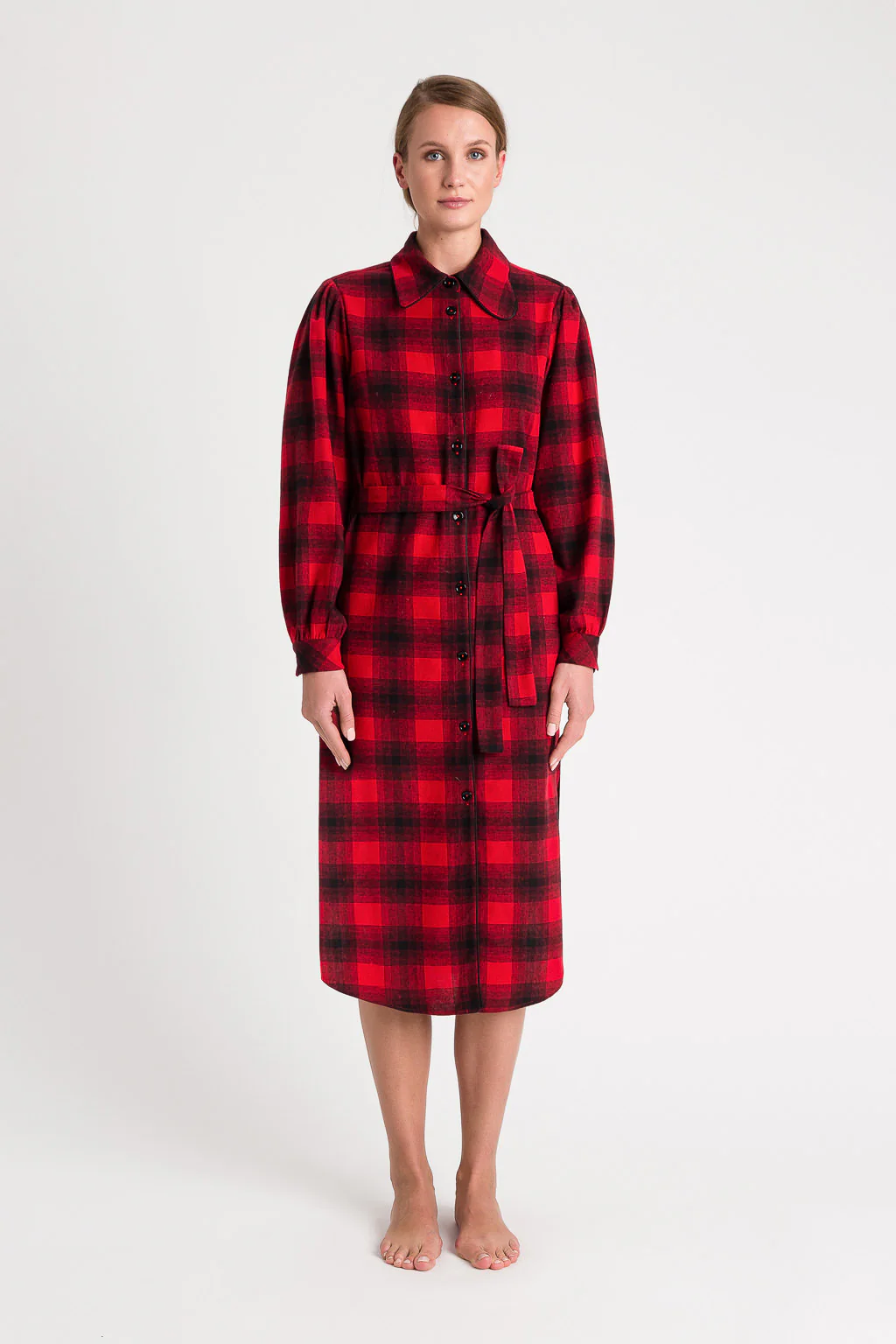 Capo timeless per eccellenza, l’abito chemisier della capsule Gioiella de Twin sfoggia un grintoso disegno check, il colletto francese a punta su un lato e a cuore sull’altro, maniche lunghe con polsino, chiusura con bottoni, tasche ai fianchi, cintura in tessuto, fondo arrotondato. Con combat boots per un look di carattere.