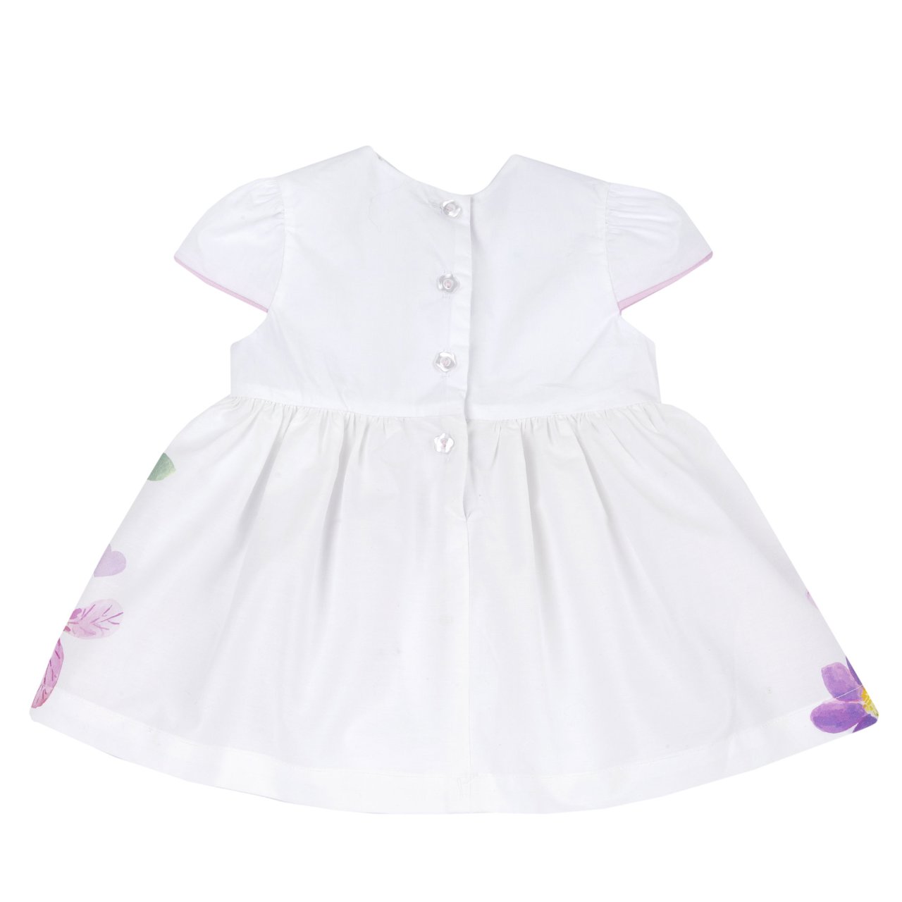 Abitino CHICCO per bambina. Modello girocollo con manica ad aletta. Color bianco con fantasia floreale rosa e lilla. Completamente foderato in cotone. Chiusura posteriore con bottoncini. Perfetto per chi ama vestire la propria bimba come una principessa oppure anche per una cerimonia.