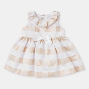 Abito CHICCO per battesimi e cerimonie. Modello girocollo senza manica. Color avorio e oro in una particolare fantasia a quadri.ย Sottogonna in cotone color bianco con balza in tulle.