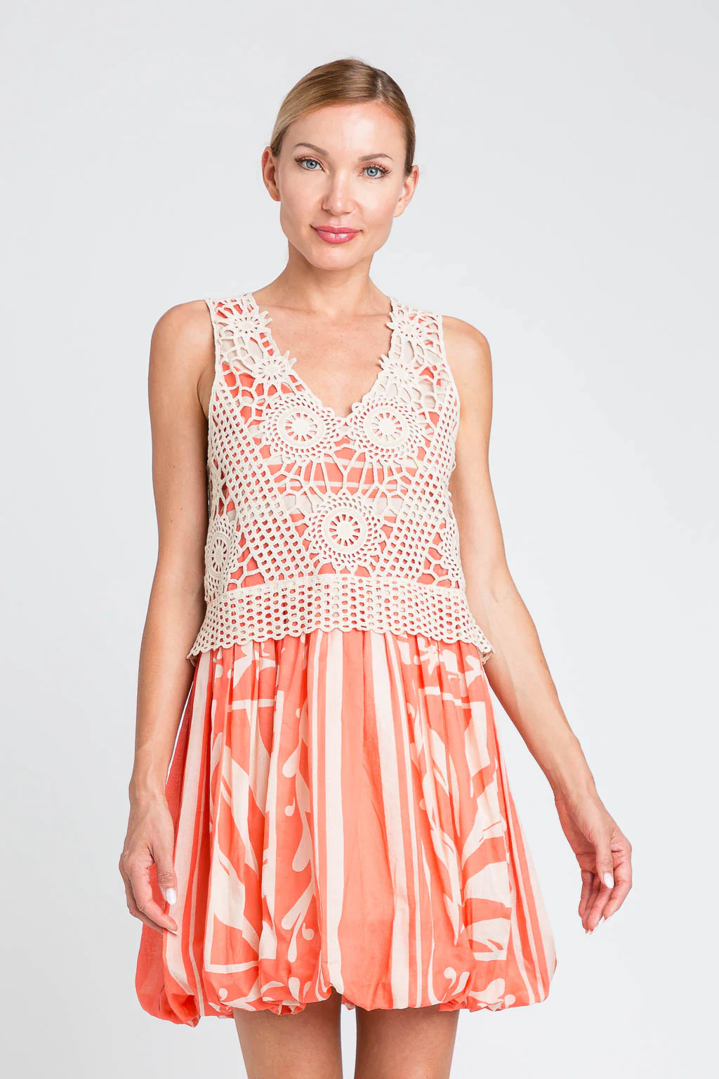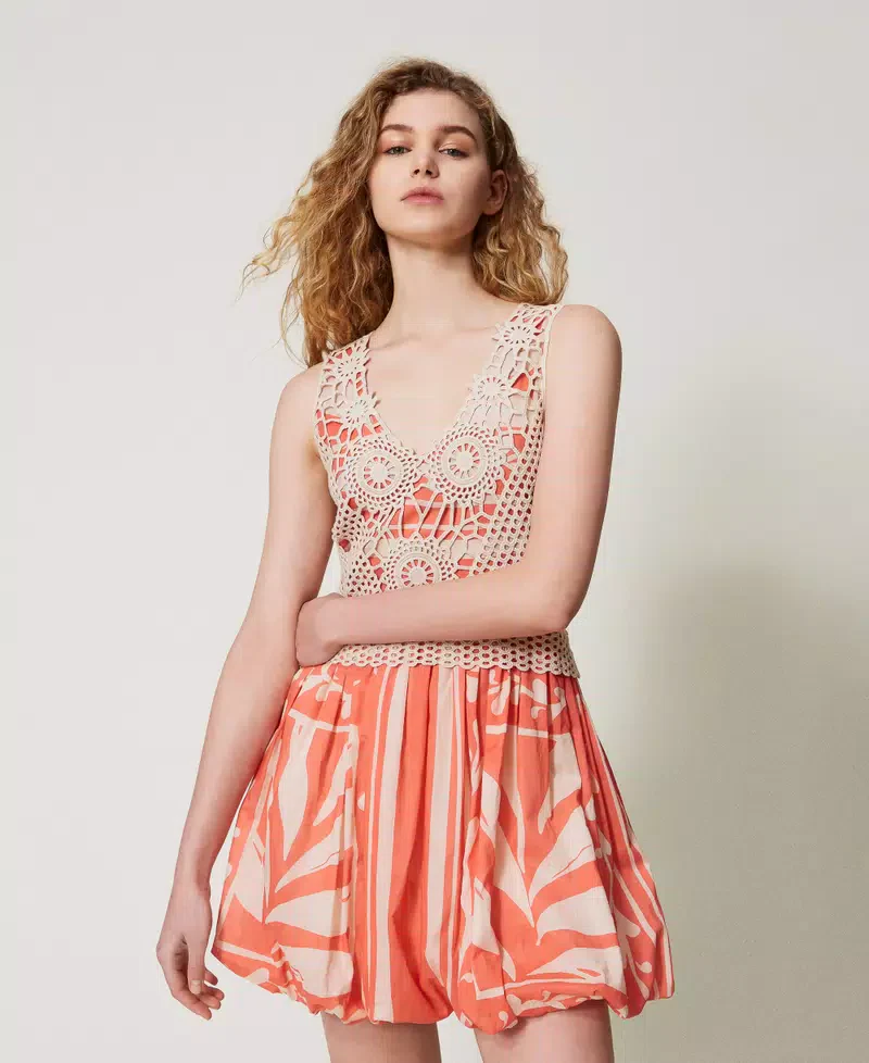 Abito corto in mussola di cotone con stampa a motivo foulard, fantasia esclusiva Twinset e corpetto sovrapposto realizzato a crochet. Ha scollatura a V, spalline ampie, taglio in vita e gonna balloon, fodera in mussola di cotone, logo a cuore in metallo sul retro, linea morbida.