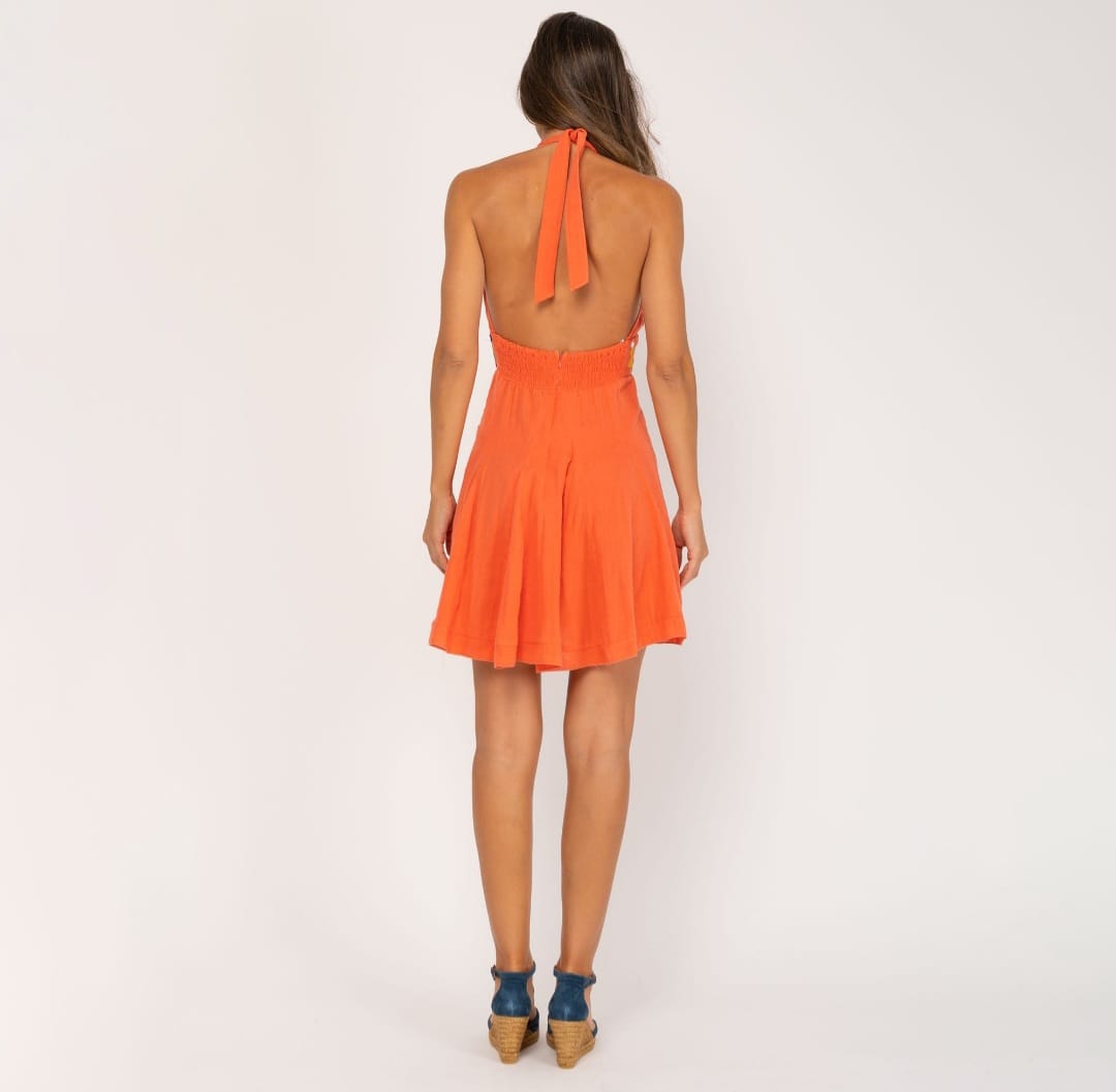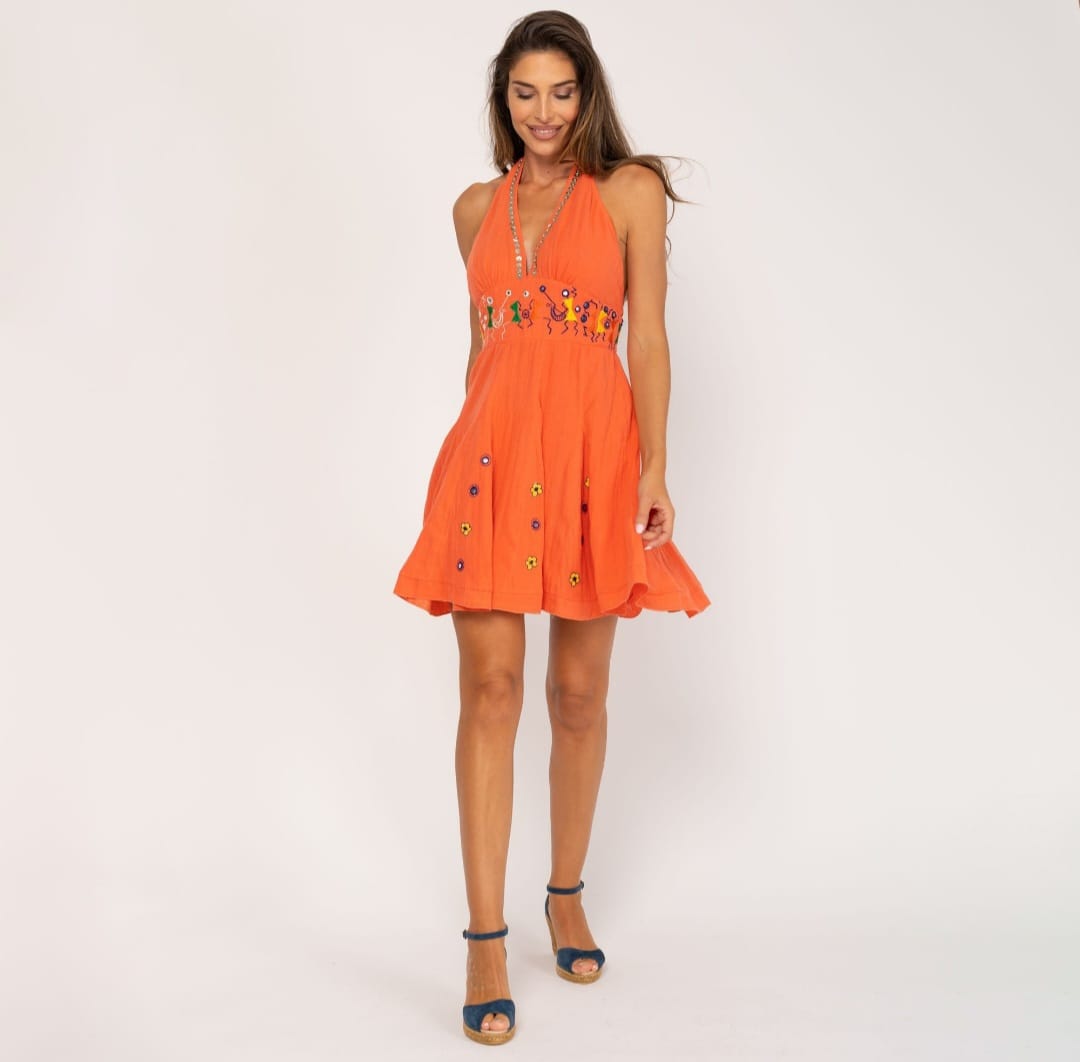 Abito donna marca PEACE AND LOVE , modello con gonna ampia ed elastico in vita, color arancione con ricami sul punto vita e sulla gonna. Applicazioni colorate sullo scollo del seno. Abito in 100% cotone. Allacciatura al collo, schiena libera.