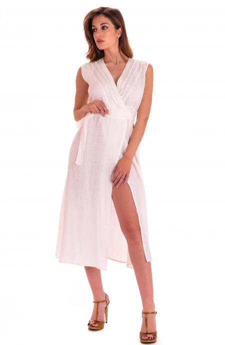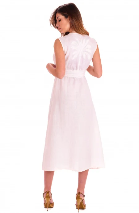 Abito in lino incrociato lungo in lino. Sul retro una delicata palma ricamata in filo di cotone accentuerร lo stile romantico e suggestivo del vostro outfit da serata estiva. Abbinatelo ad un sandalo ed accessori colorati per un look contemporary chic.