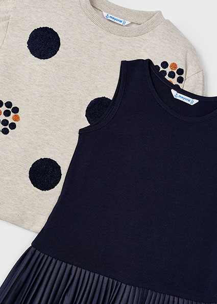 Abito MAYORAL, lunghezza al ginocchio, modello invernale leggermente felpato.ย Composto da scamiciato blu sottostante con balza a plissรจ. Maglione sovrastante modello girocollo color beige con trama lurex. Applicazione di pois blu in rilievo.