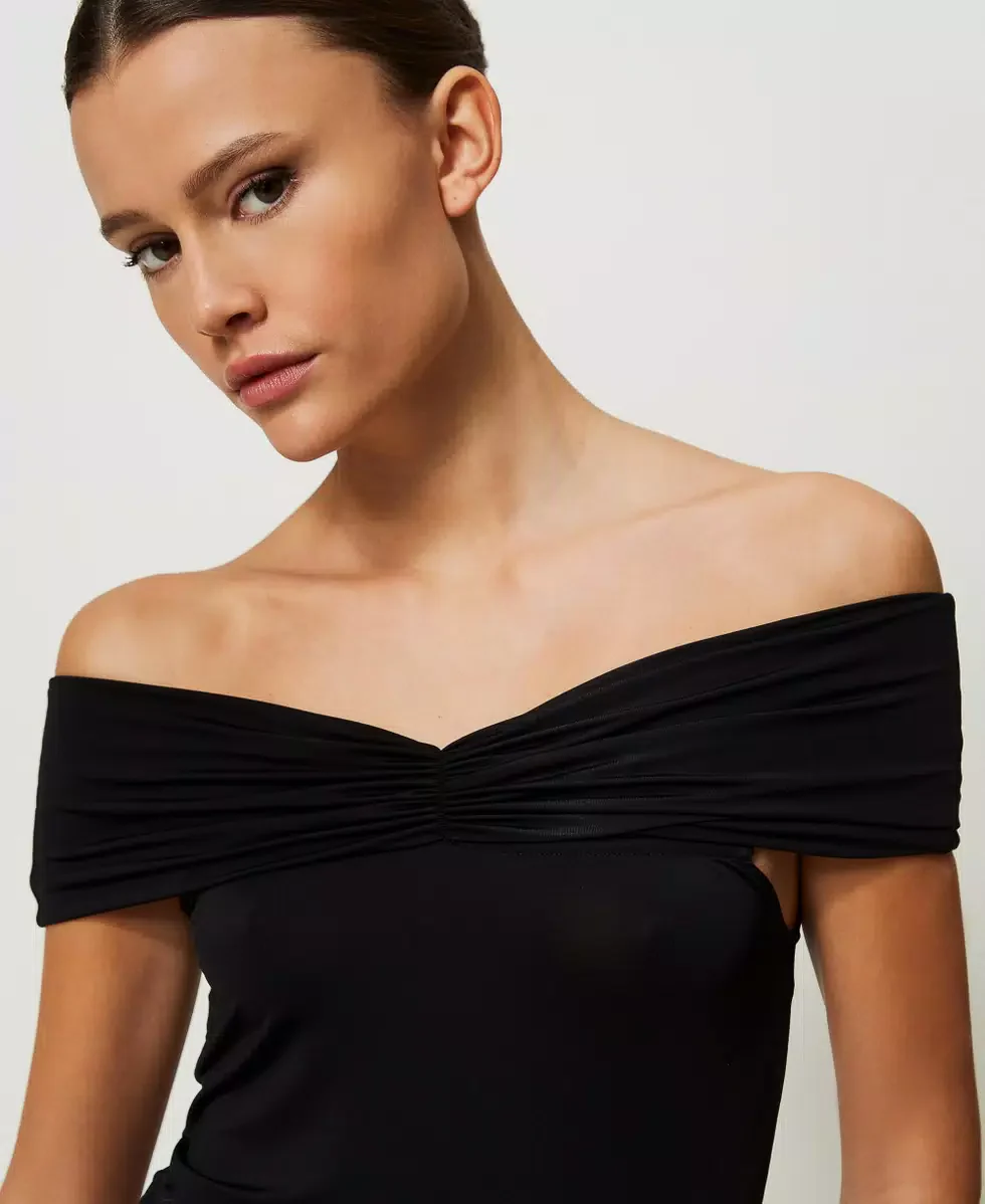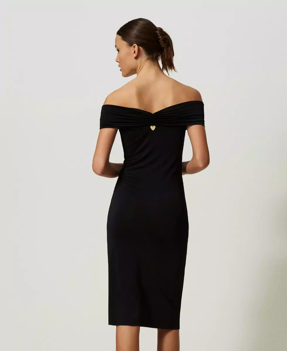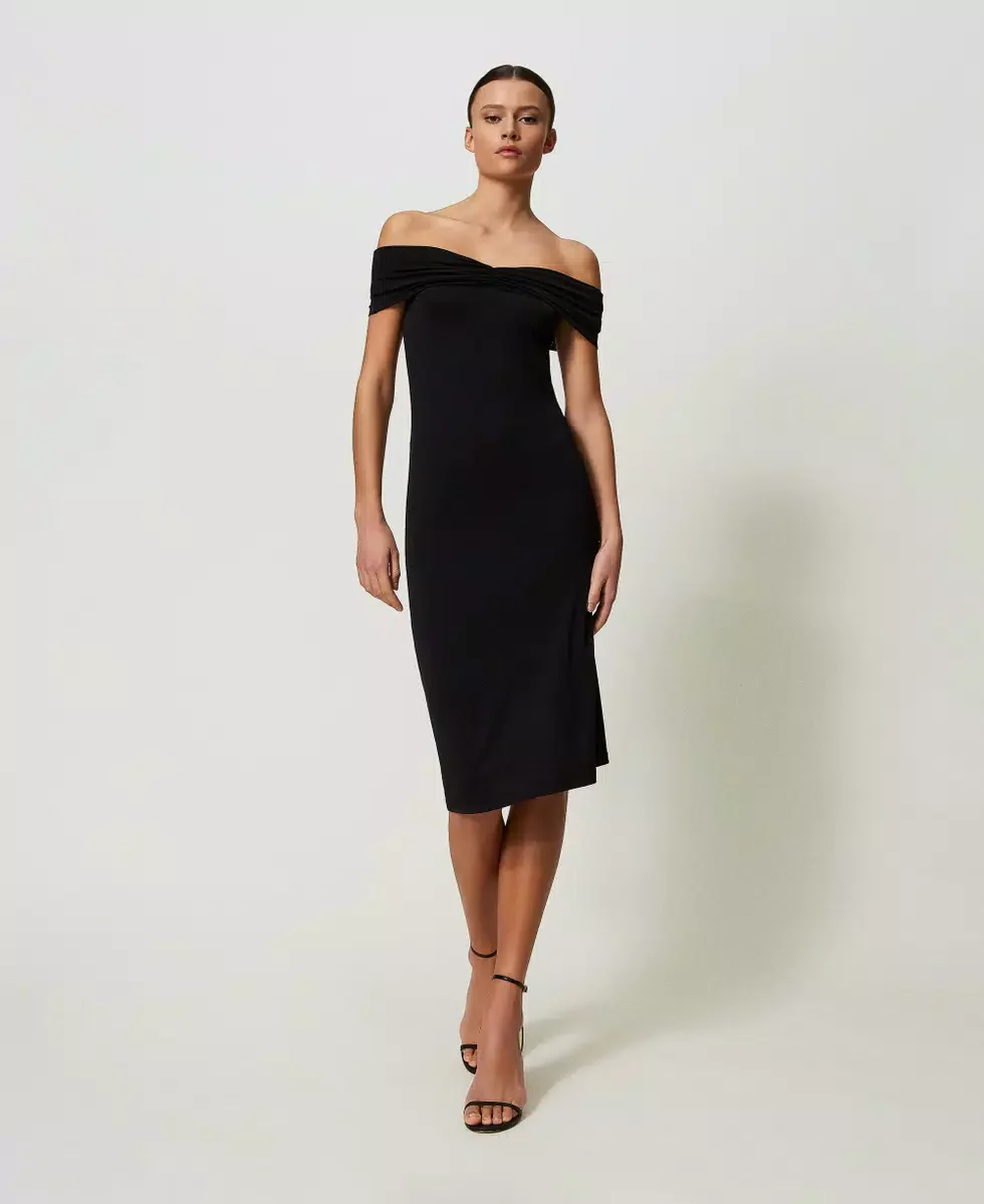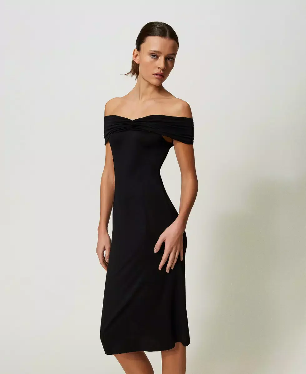 Abito longuette in jersey lucido di viscosa con ampio scollo con arricciatura, da indossare sulle spalle o off shoulder.