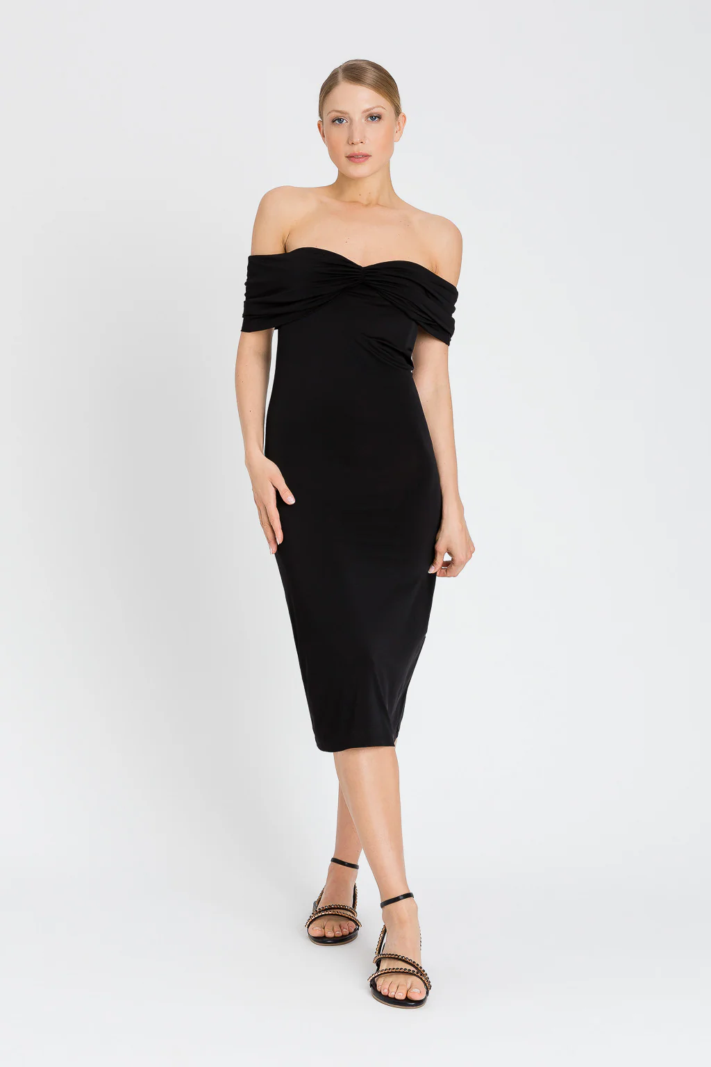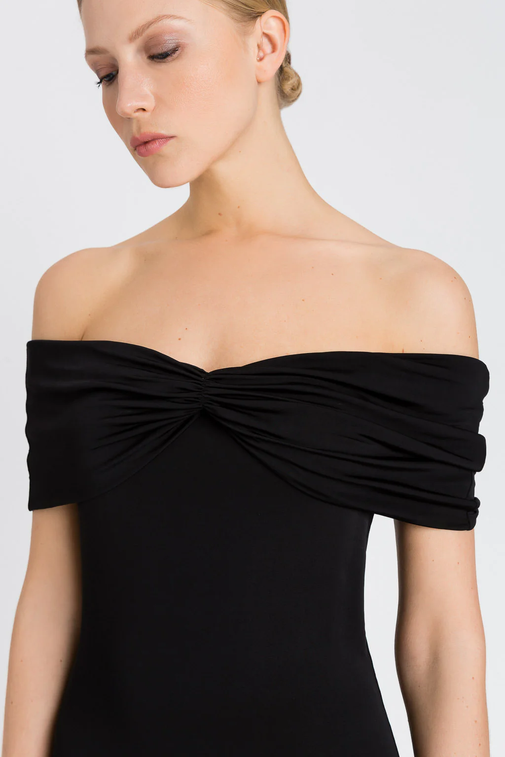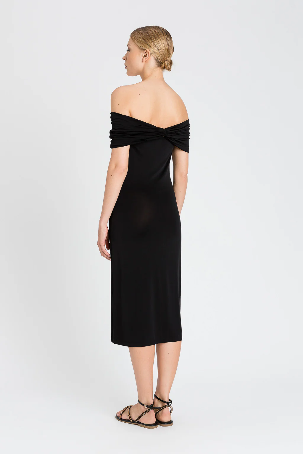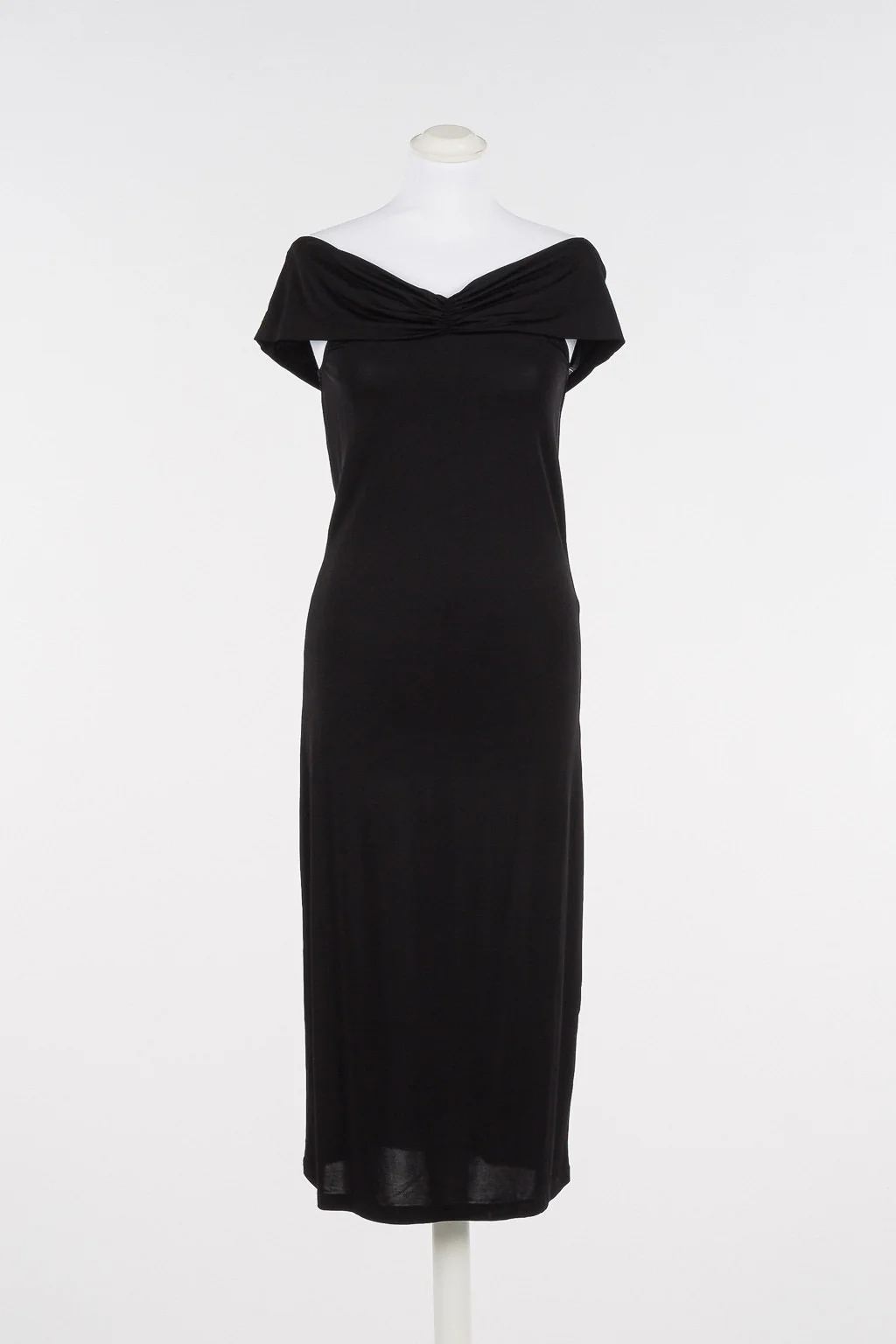 Abito longuette in jersey lucido di viscosa con ampio scollo con arricciatura, da indossare sulle spalle o off shoulder.