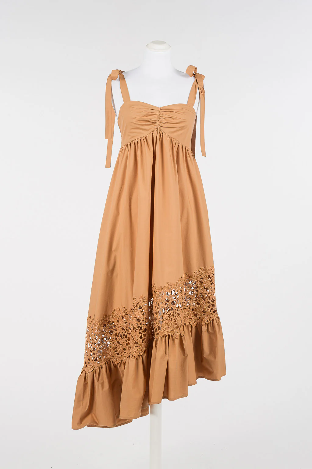 Abito longuette asimmetrico in popeline di cotone con inserto in macramรจ in trasparenza, con arricciatura al corpetto e balza al fondo. Ha spalline regolabili da annodare a fiocco, coppe senza imbottiture e ferretti, tasche inserite ai fianchi, retro con ricamo elastico in punto smock e logo a cuore in metallo, linea morbida con corpetto fitted.