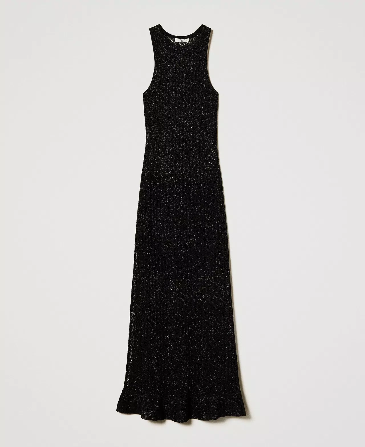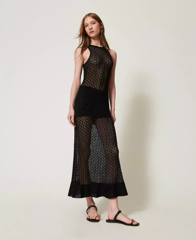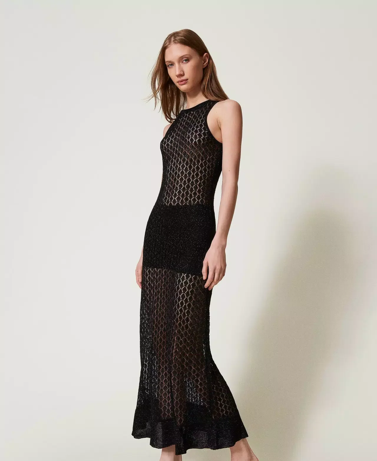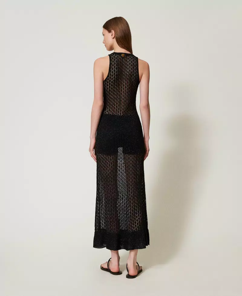 Abito lungo a rete in filato lurex, collo tondo, logo a cuore sul retro, fodera, linea fitted.