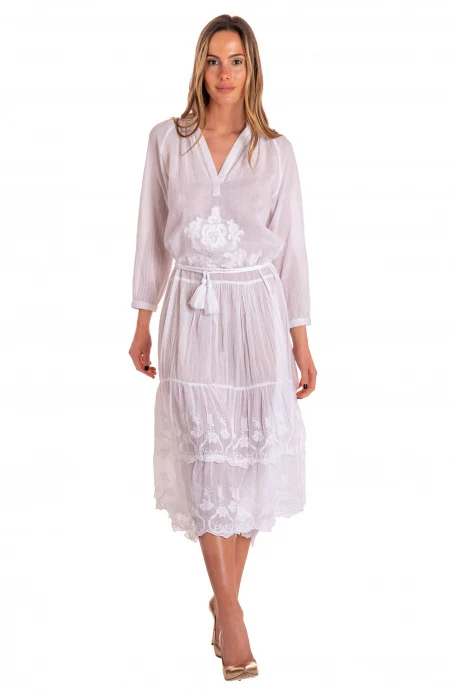 Leggero cotone vestirร le vostre giornate piรน calde. Una sottile cintura in corda in vita con nappe finali accentuerร il punto vita. Un ricamo in sangallo alle estremitร lo riempiono di eleganza, ma accoppiato a colori vivaci sarร giovanile e moderno. Da spiaggia per un look cool o da sera con accessori dorati.