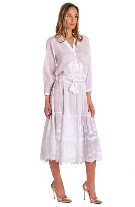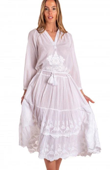 Abito lungo in 100% cotone vestirร la vostra silhouette in leggerezza e comoditร , cinturina con nappe finali accentuerร il punto vita.