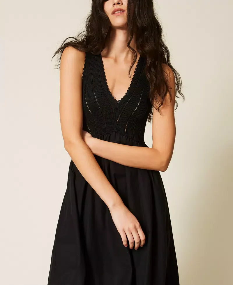 Abito lungo con corpetto in maglia di cotone a coste punzonate e gonna in tessuto. Ha scollatura a V, tagli diagonali e pieghe in vita, logo a cuore in metallo sul retro, linea svasata. Codice prodotto: 261LB3EDD Nero- Bianco Linea svasata Altezza modella: 178 cm. Taglia indossata: XS/40 100% cotone. Materiale 2: 65% viscosa 35% […]