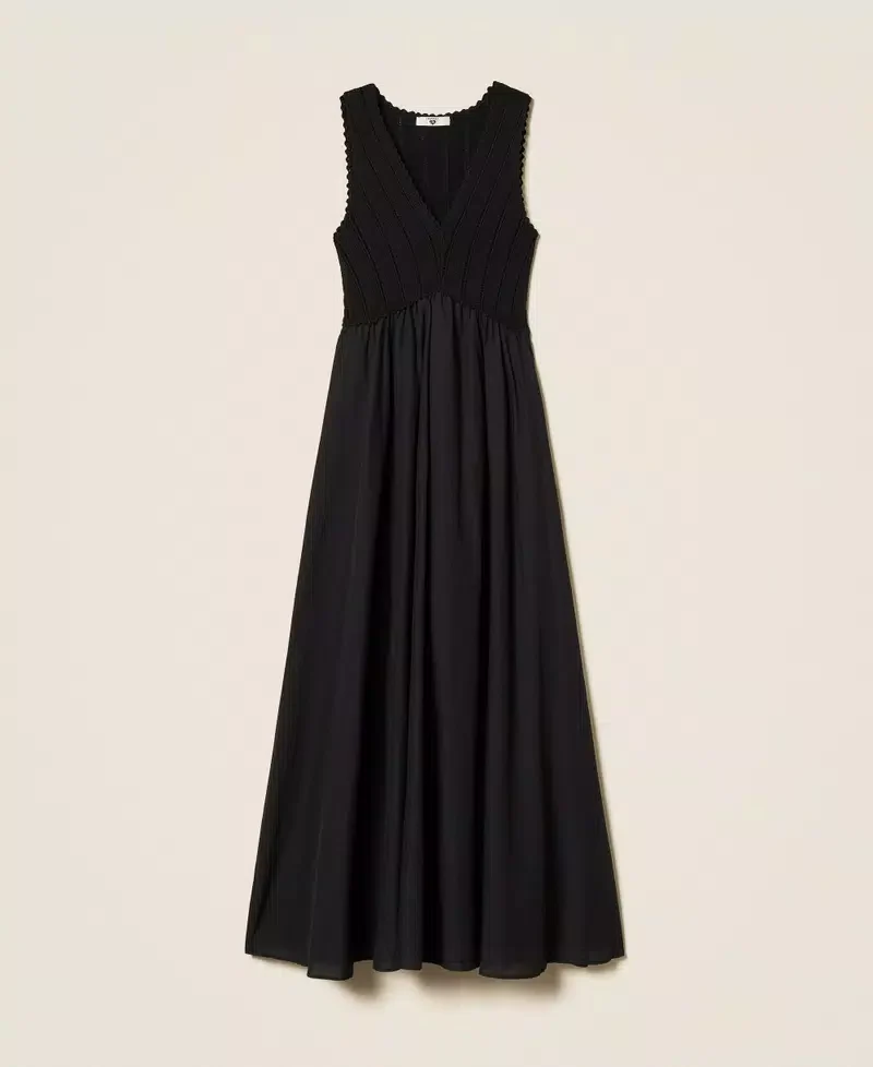 Abito lungo con corpetto in maglia di cotone a coste punzonate e gonna in tessuto. Ha scollatura a V, tagli diagonali e pieghe in vita, logo a cuore in metallo sul retro, linea svasata.