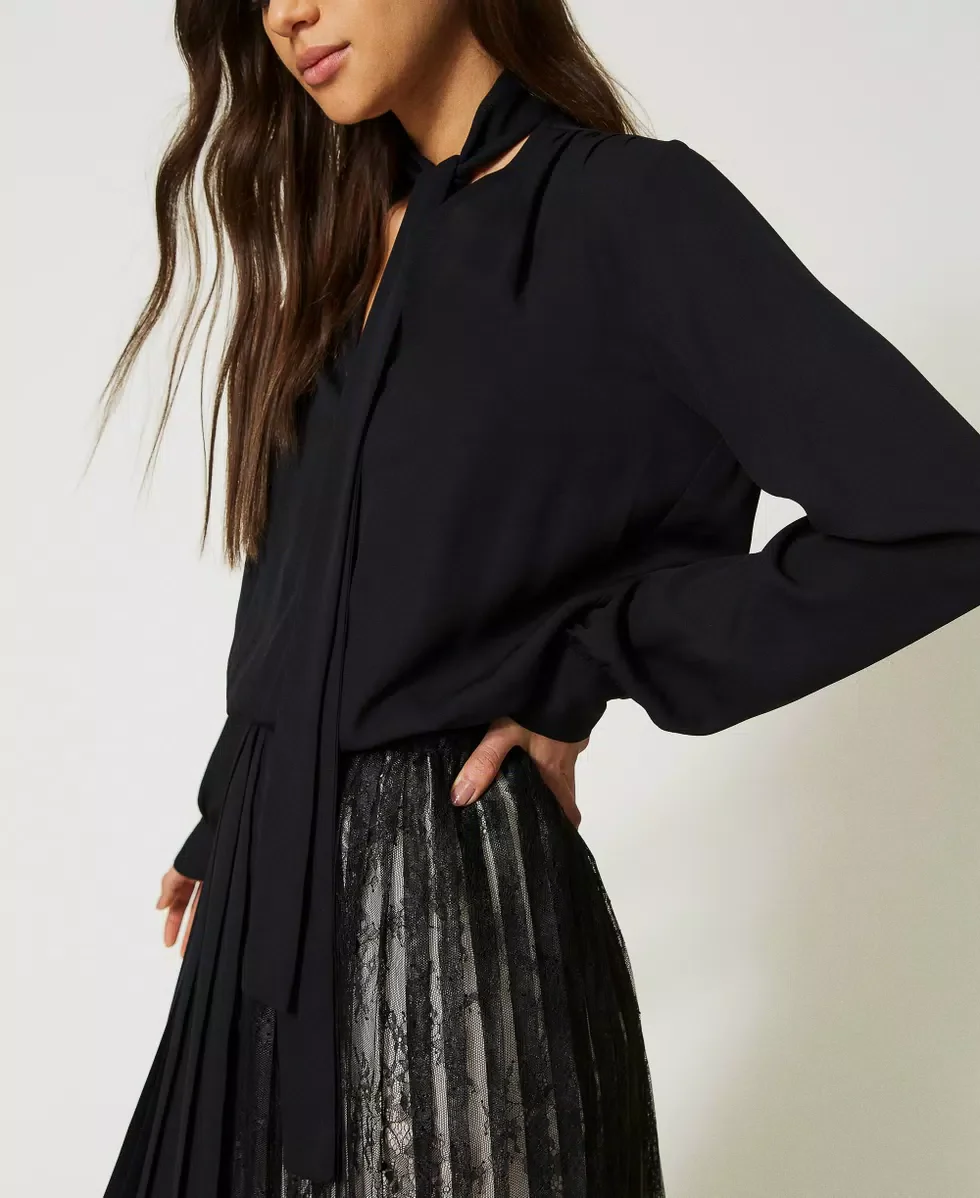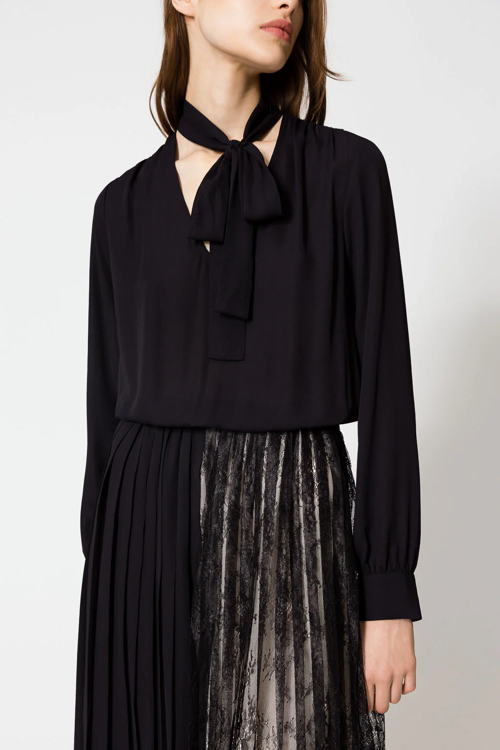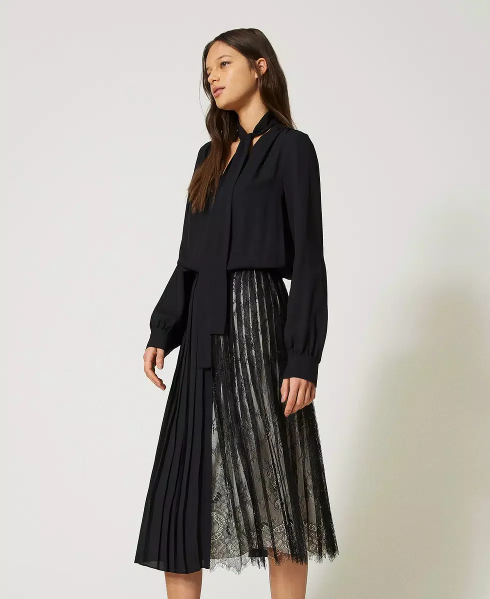 Abito longuette in georgette con scollatura a V, colletto a solino con nastro, maniche lunghe, gonna plissรฉ con parte in pizzo.