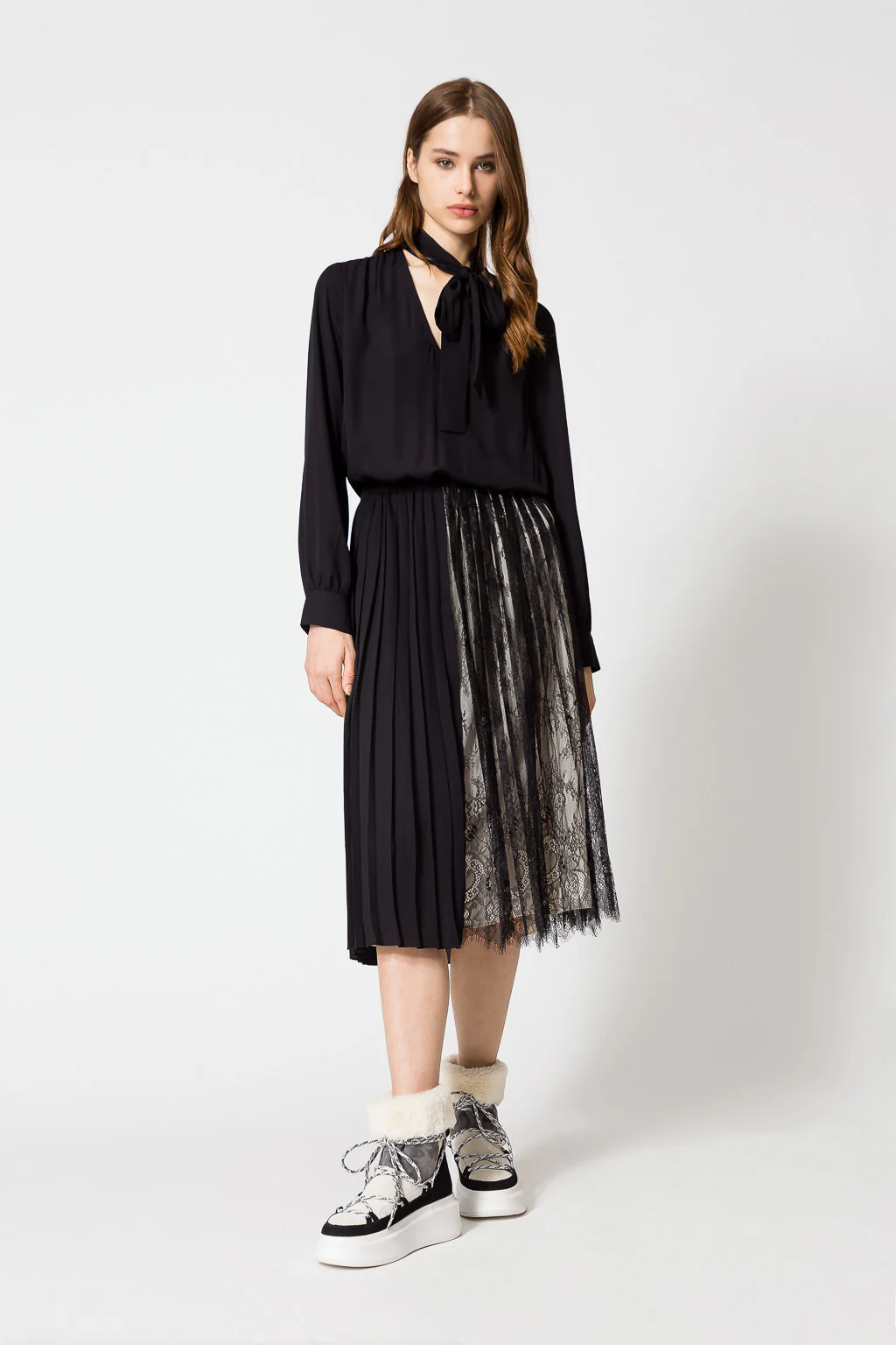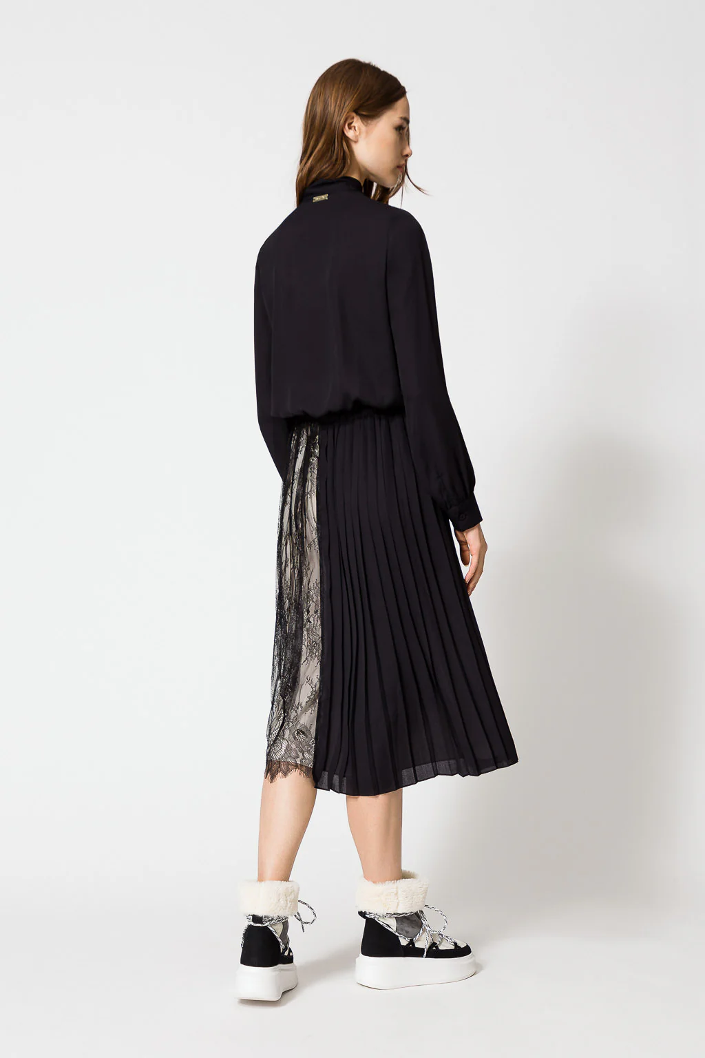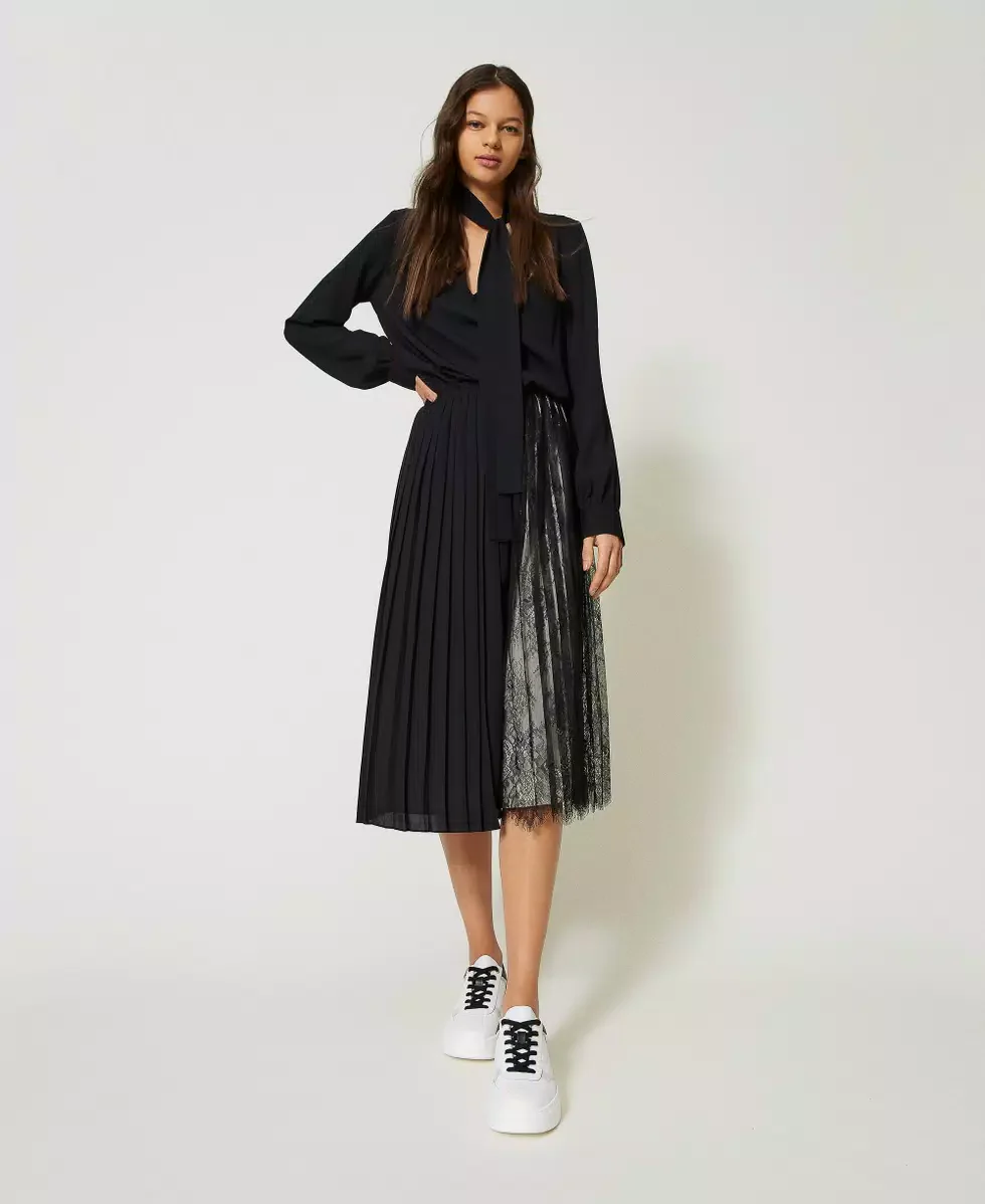 Abito longuette in georgette con scollatura a V, colletto a solino con nastro, maniche lunghe, gonna plissรฉ con parte in pizzo.