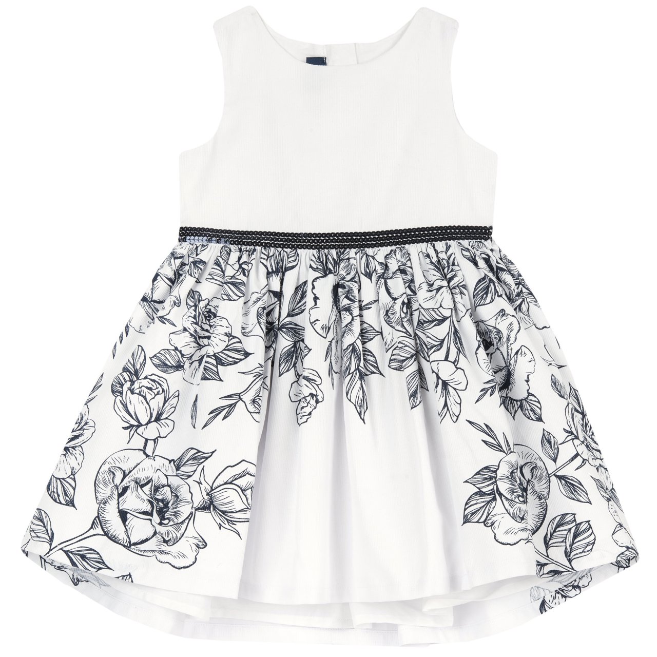 Particolare abito cerimonia CHICCO. Modello smanicato in tessuto di cotone.ย Chiusura posteriore con cerniera invisibile. Color base bianco con ampia gonna con sottogonna in cotone. Design con rose blu e paillettes blu a segnare il punto vita.