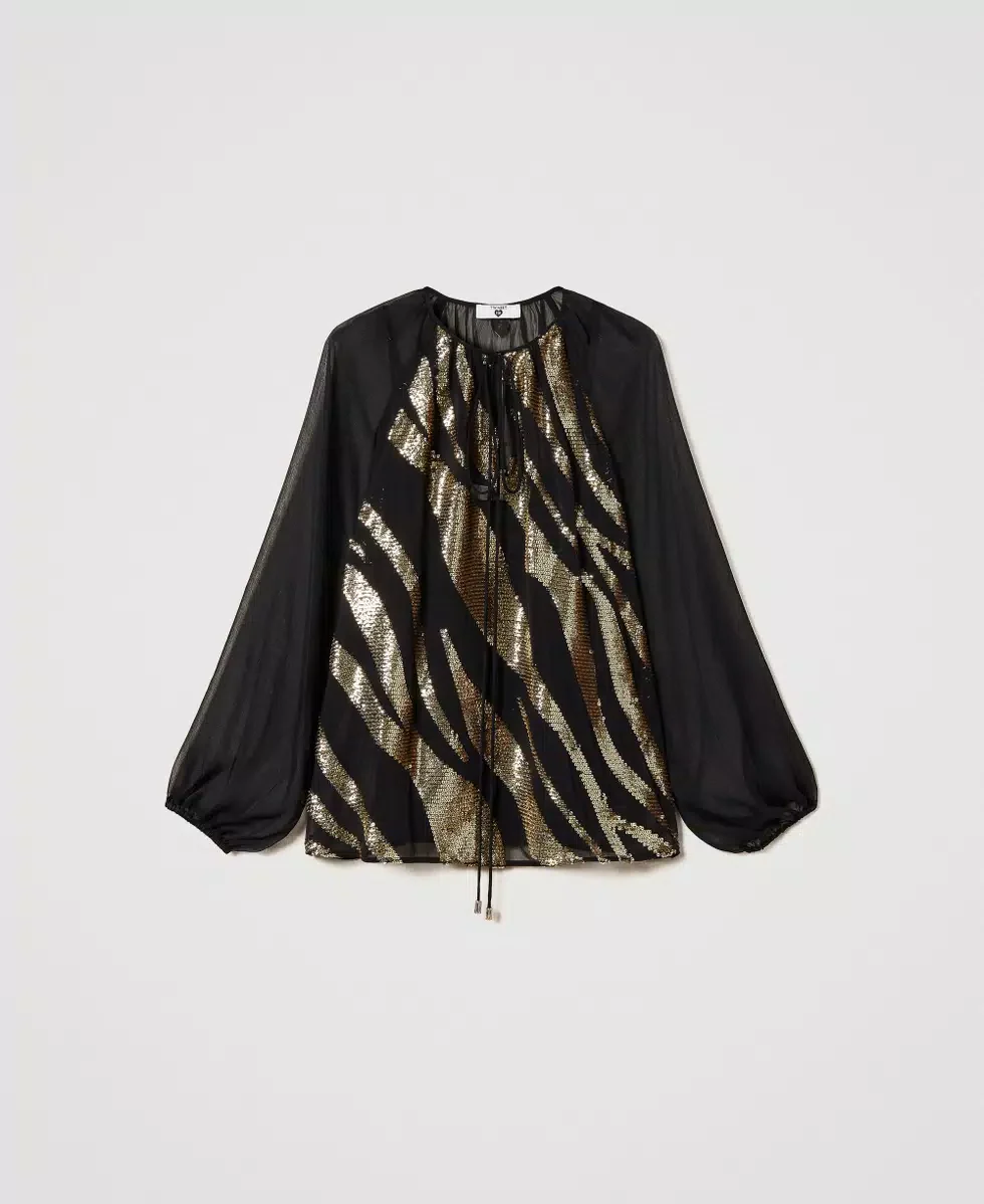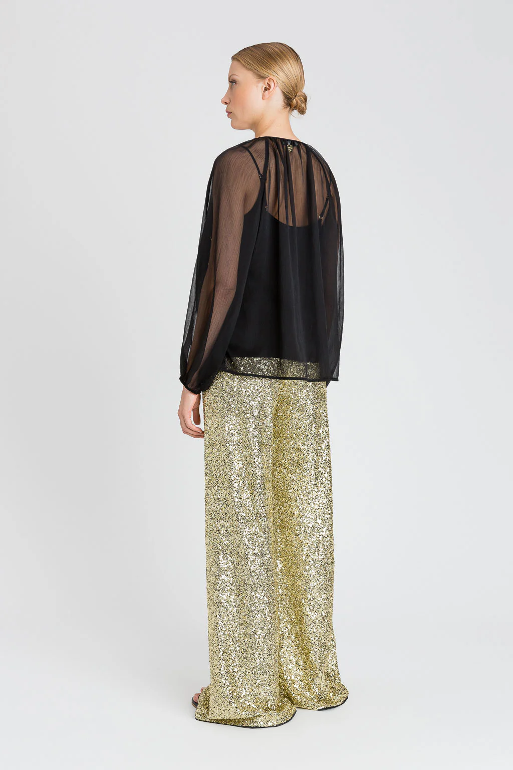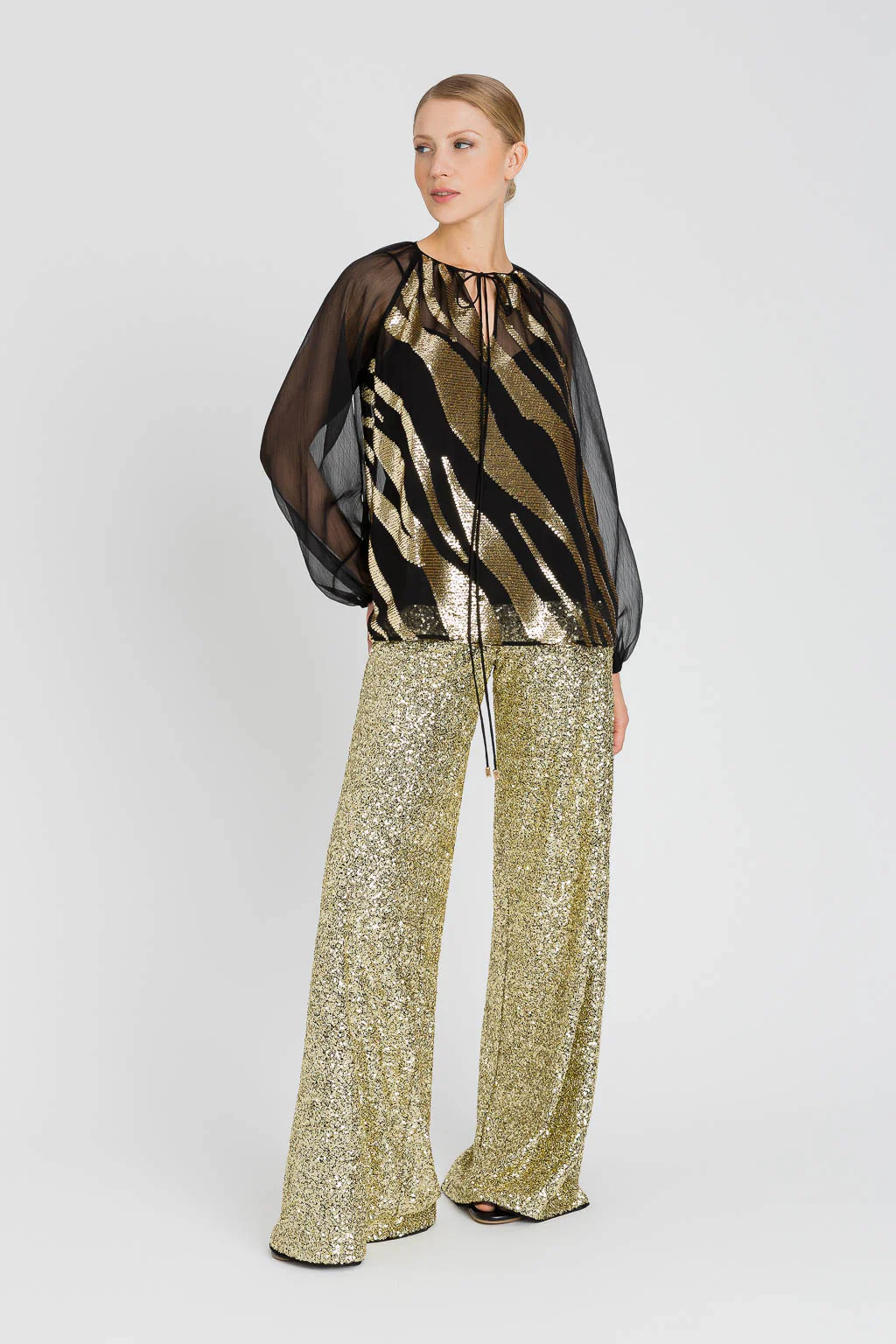 Blusa in georgette con ricamo Cornely di paillettes color oro a motivo animalier, linea morbida, top in coordinato.