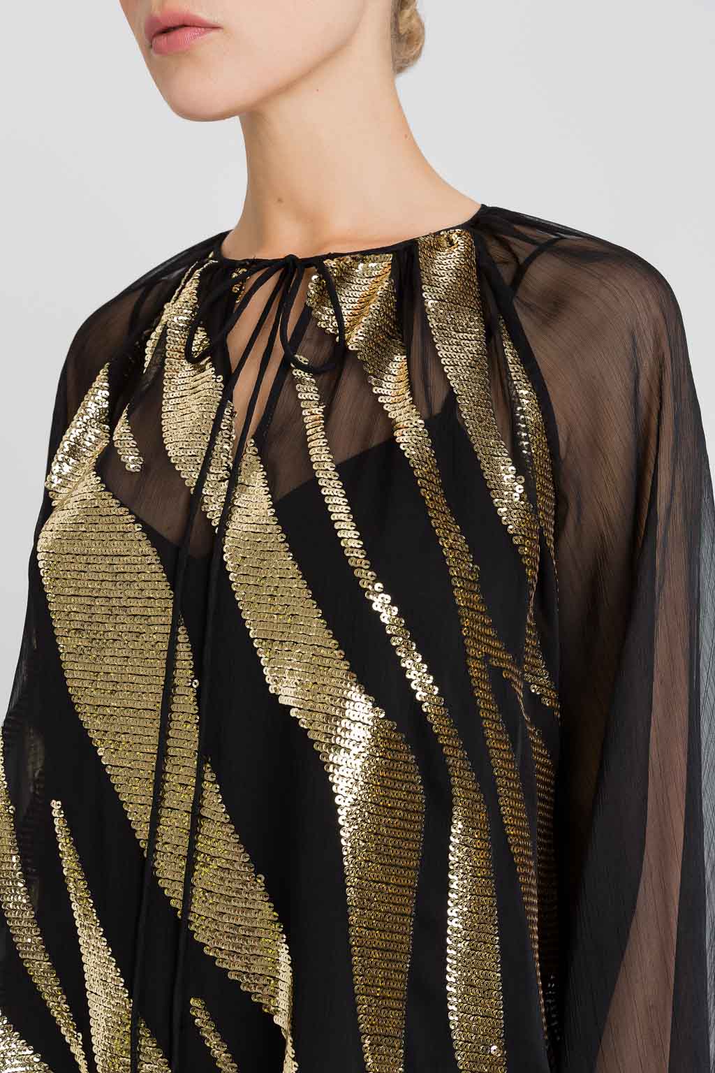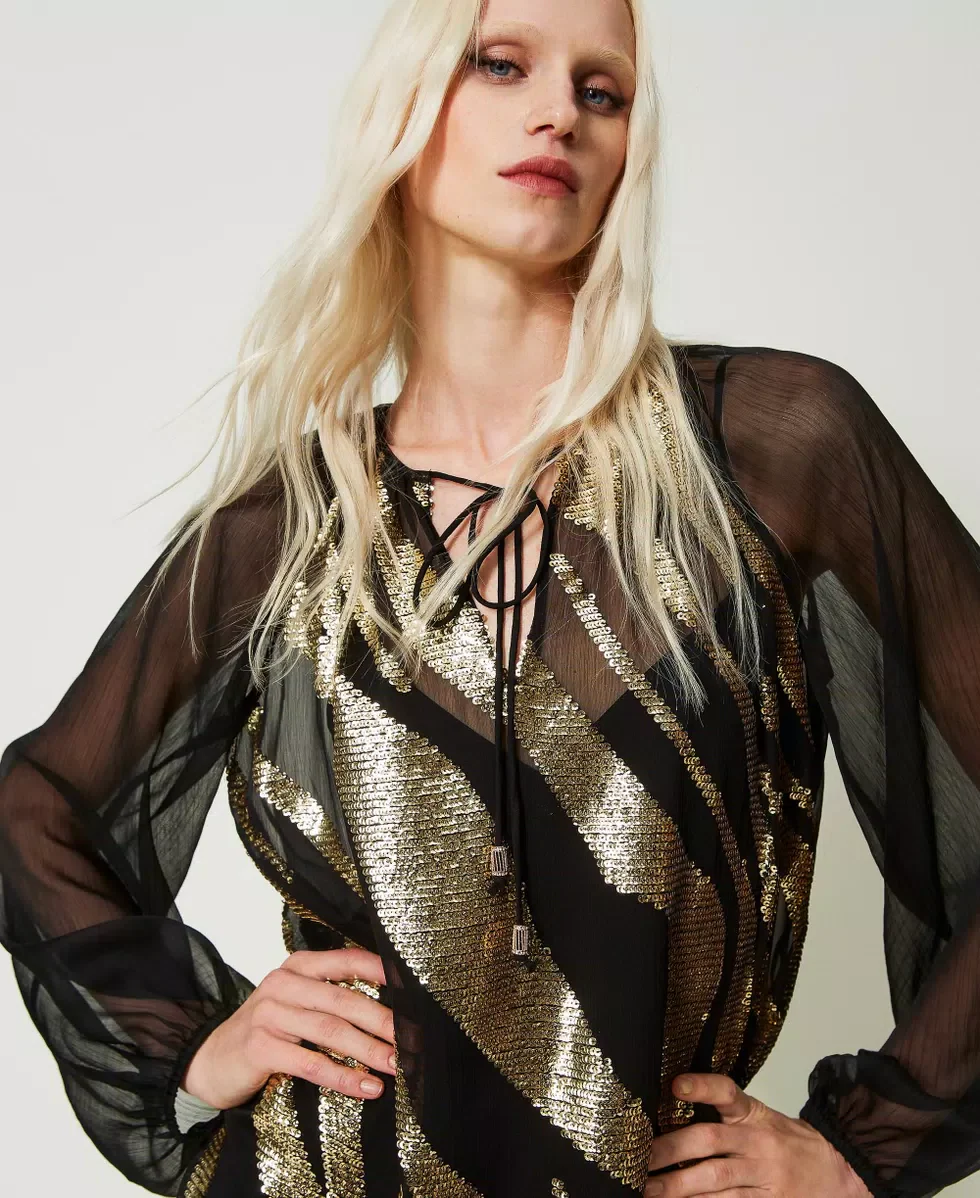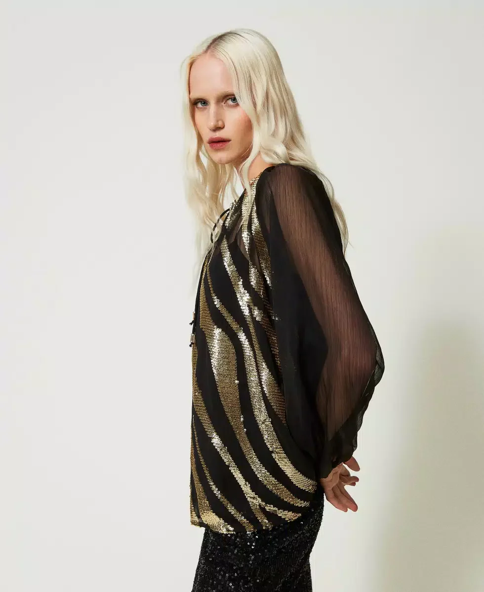 Blusa in georgette con ricamo Cornely di paillettes color oro a motivo animalier, linea morbida, top in coordinato.
