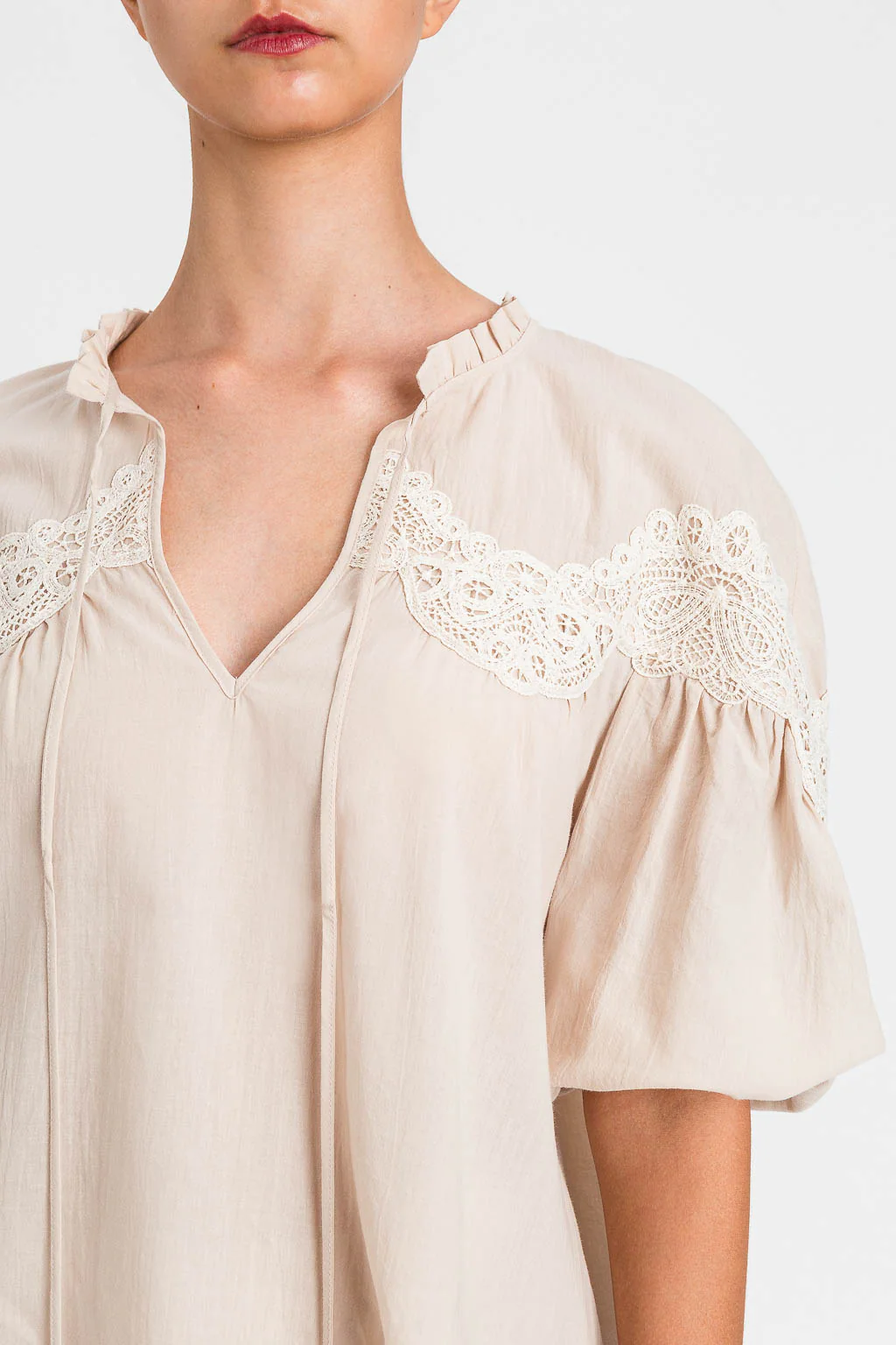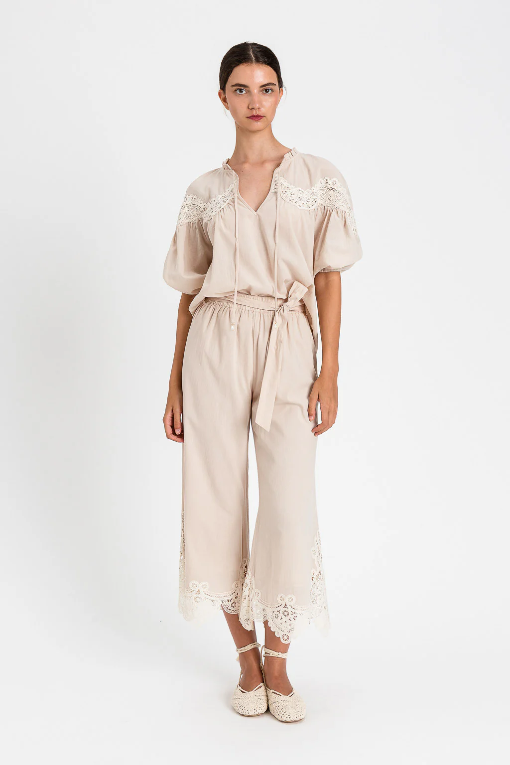 Blusa in mussola di cotone con dettagli in macramè smerlato al carré. Ha collo tondo con apertura e nastri con terminali a perla pendente, maniche balloon lunghe al gomito con fondo elastico, logo a cuore in metallo sul retro, linea morbida.