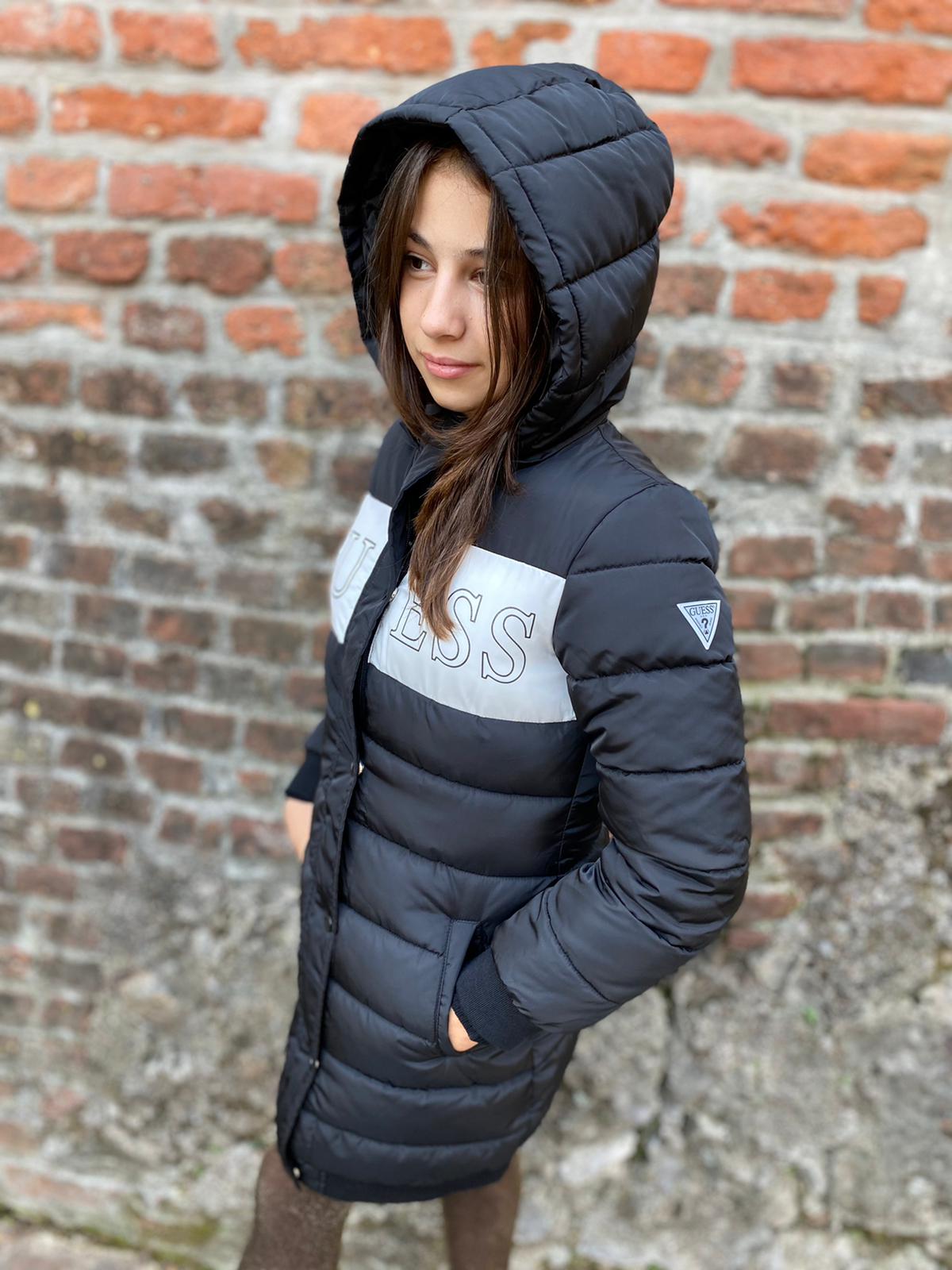 Cappottoย GUESS per ragazza invernale con chiusura con cerniera e cappuccio.ย Modello lungo al ginocchio.ย Color nero con scritta GUESS nera su base bianca. Cappuccio amovibile con cerniera.