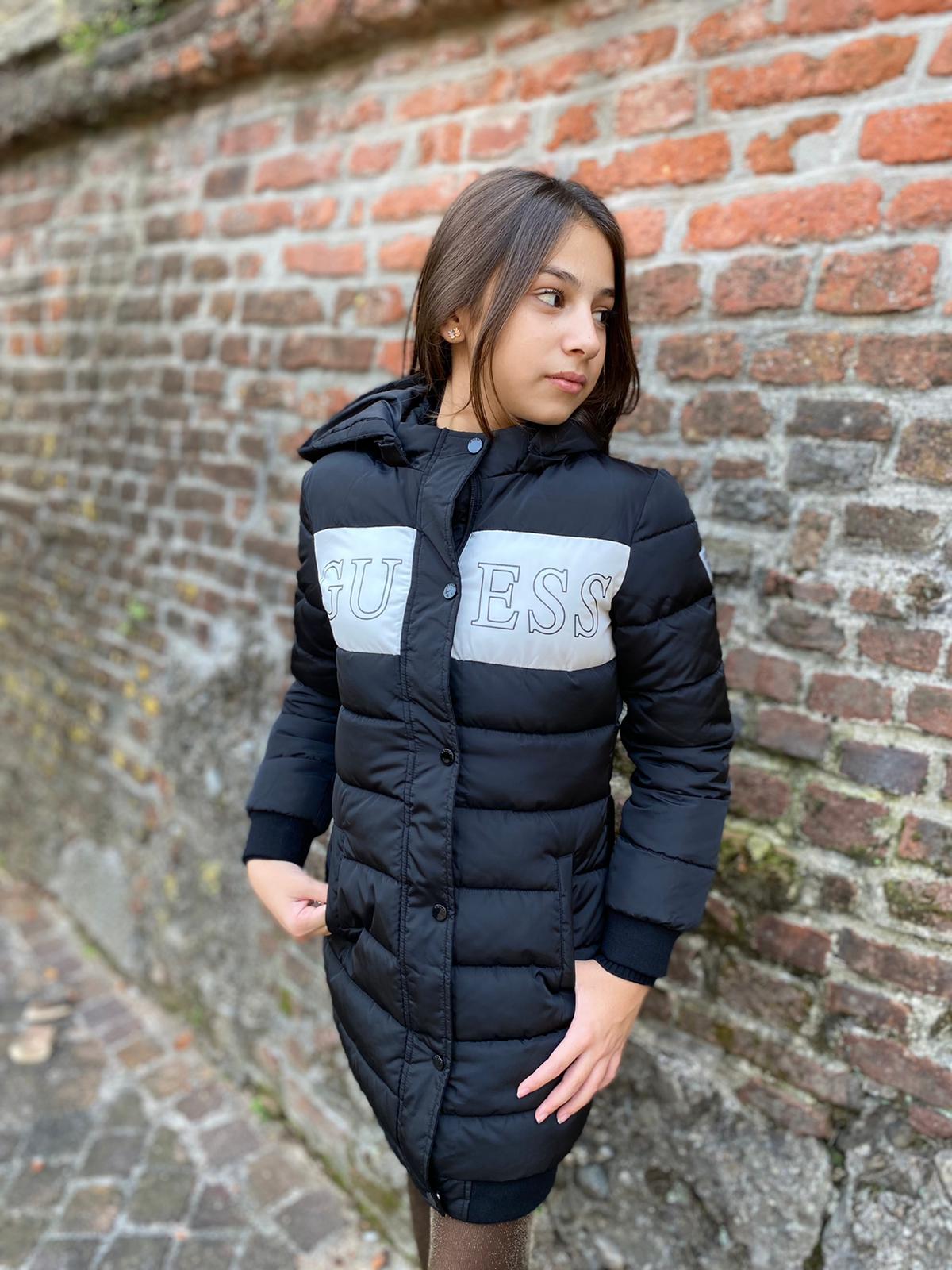 Cappotto piumino GUESS invernale per ragazza color nero con scritta GUESS su fascia bianca