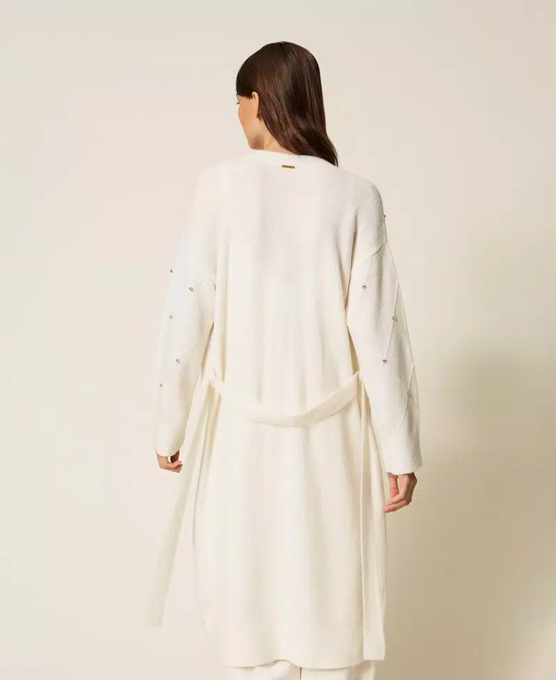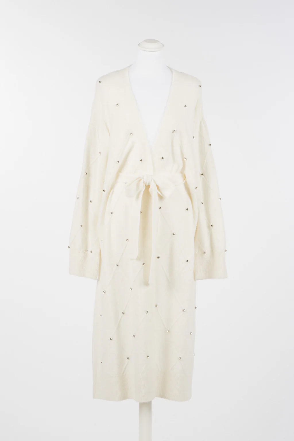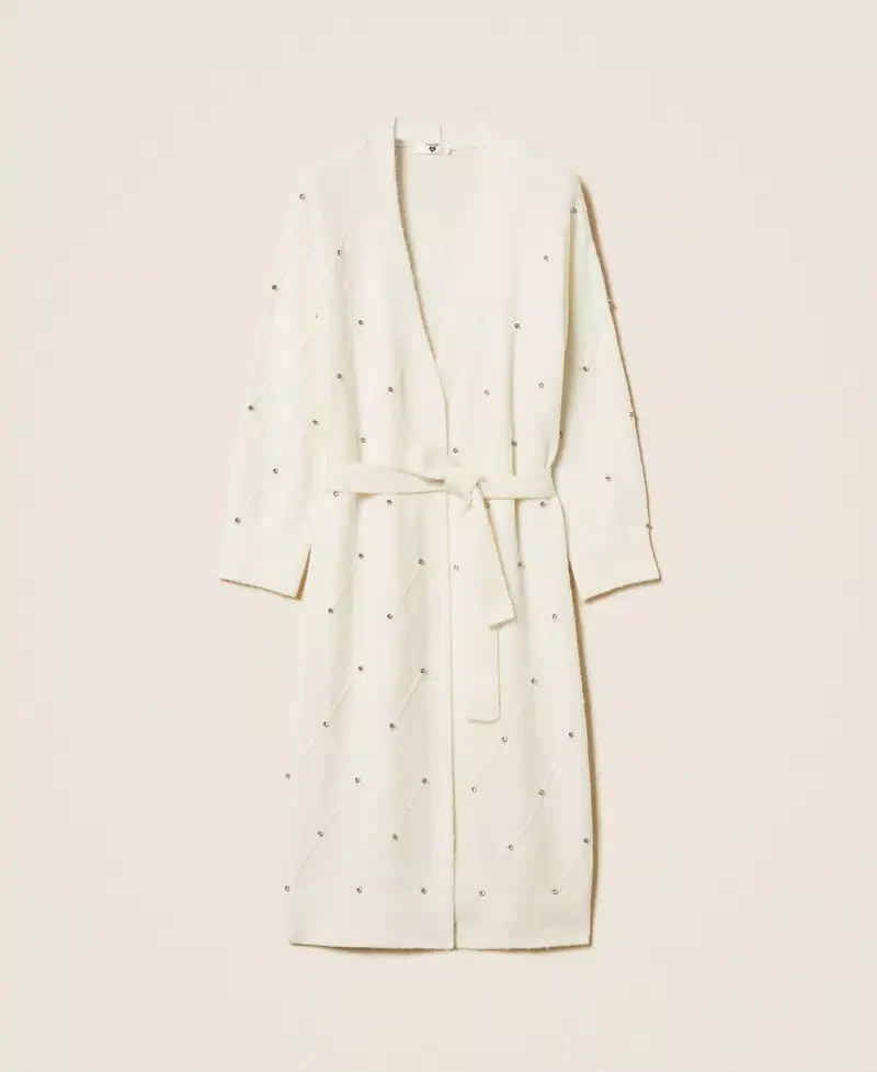 NCardigan lungo in filato di viscosa con motivo a rombi in tessitura davanti e ricamo di cabochon. Ha scollatura a V, maniche lunghe, profili rifiniti a costine, placchetta logo a cuore in metallo, cintura in coordinato, linea morbida.