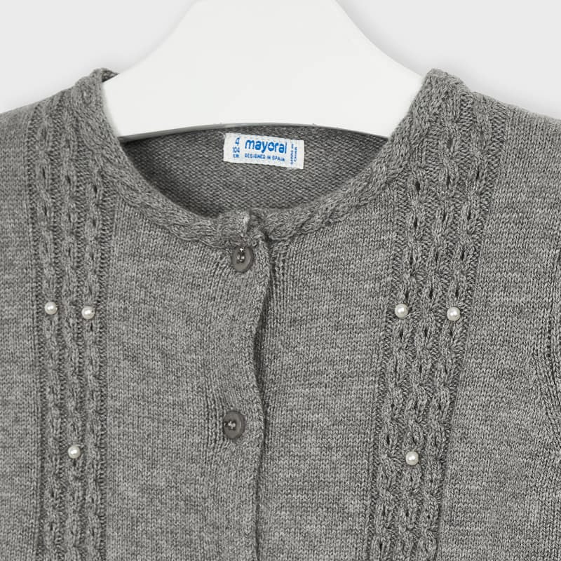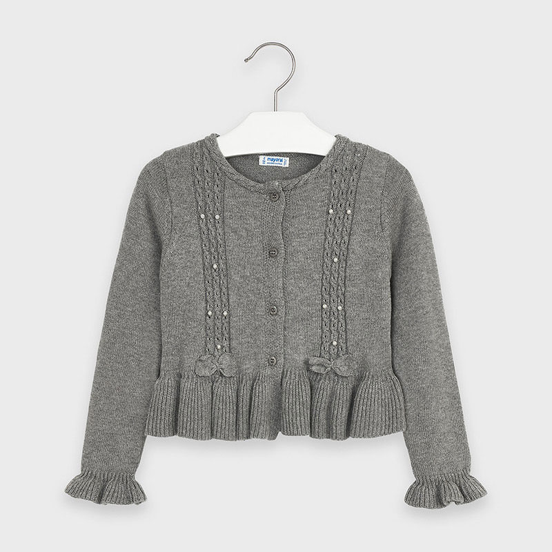 Cardigan MAYORAL modello girocollo. Modello manica lunga. Color grigio con volant sul fondo. Dettagli con fiocchetti e perline decorative. Chiusura frontale con quattro bottoncini.