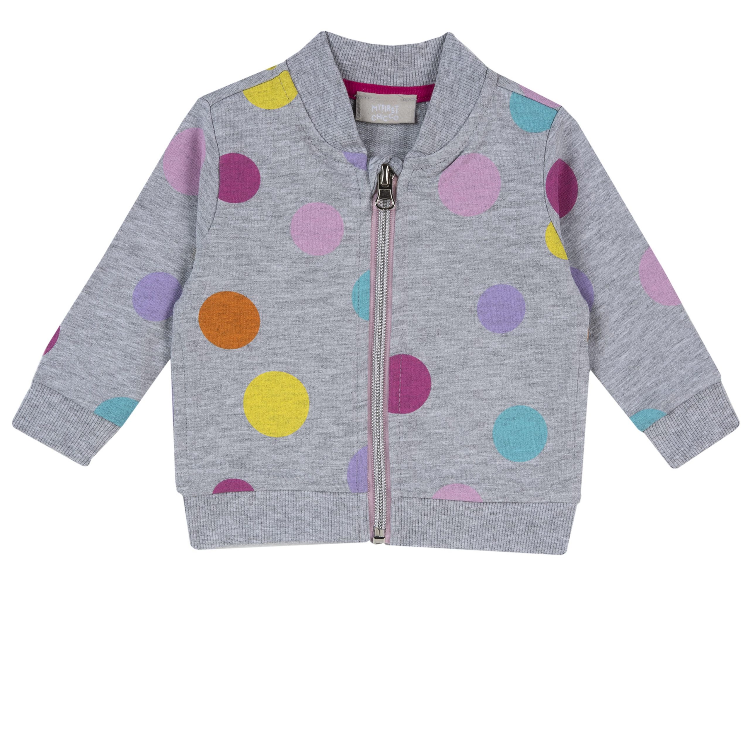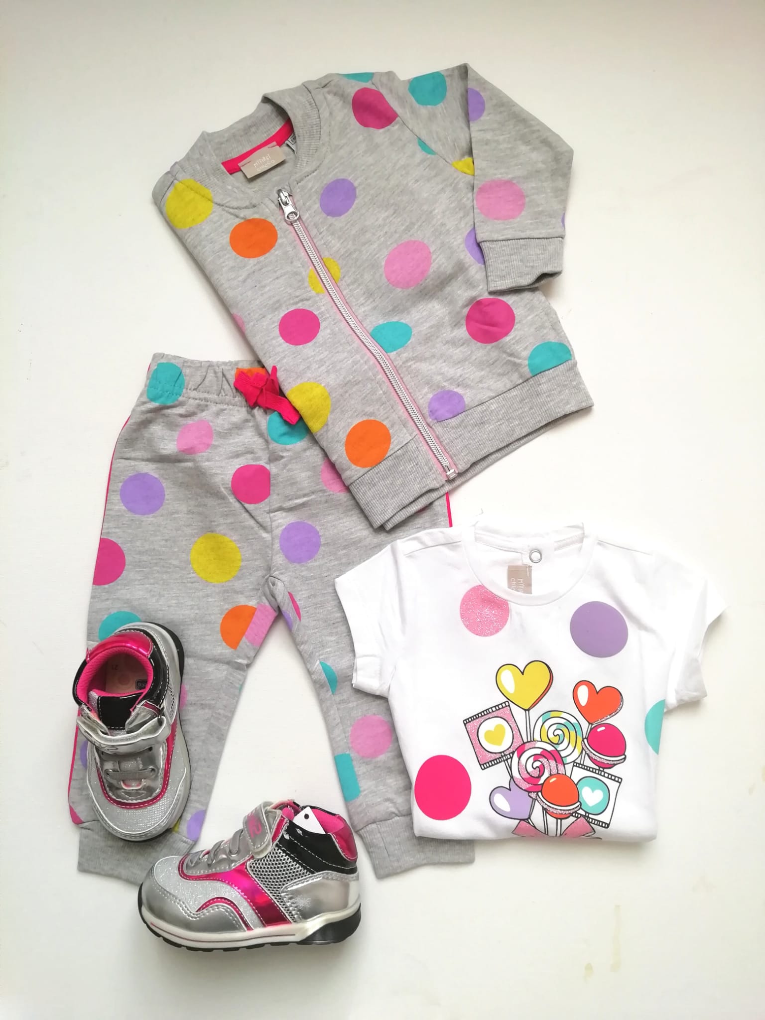 Completo CHICCO tre pezzi per bimba. Il completo รจ composto da : t-shirt manica corta in cotone. Modello a girocollo conย graziosa stampa centrale con con leccalecca e pois colorati. Dettagli glitter. Pantalone grigio con pois multicolor. Elastico in vita. Felpa zip senza cappuccio. Color grigio con pois multicolor.ย ย