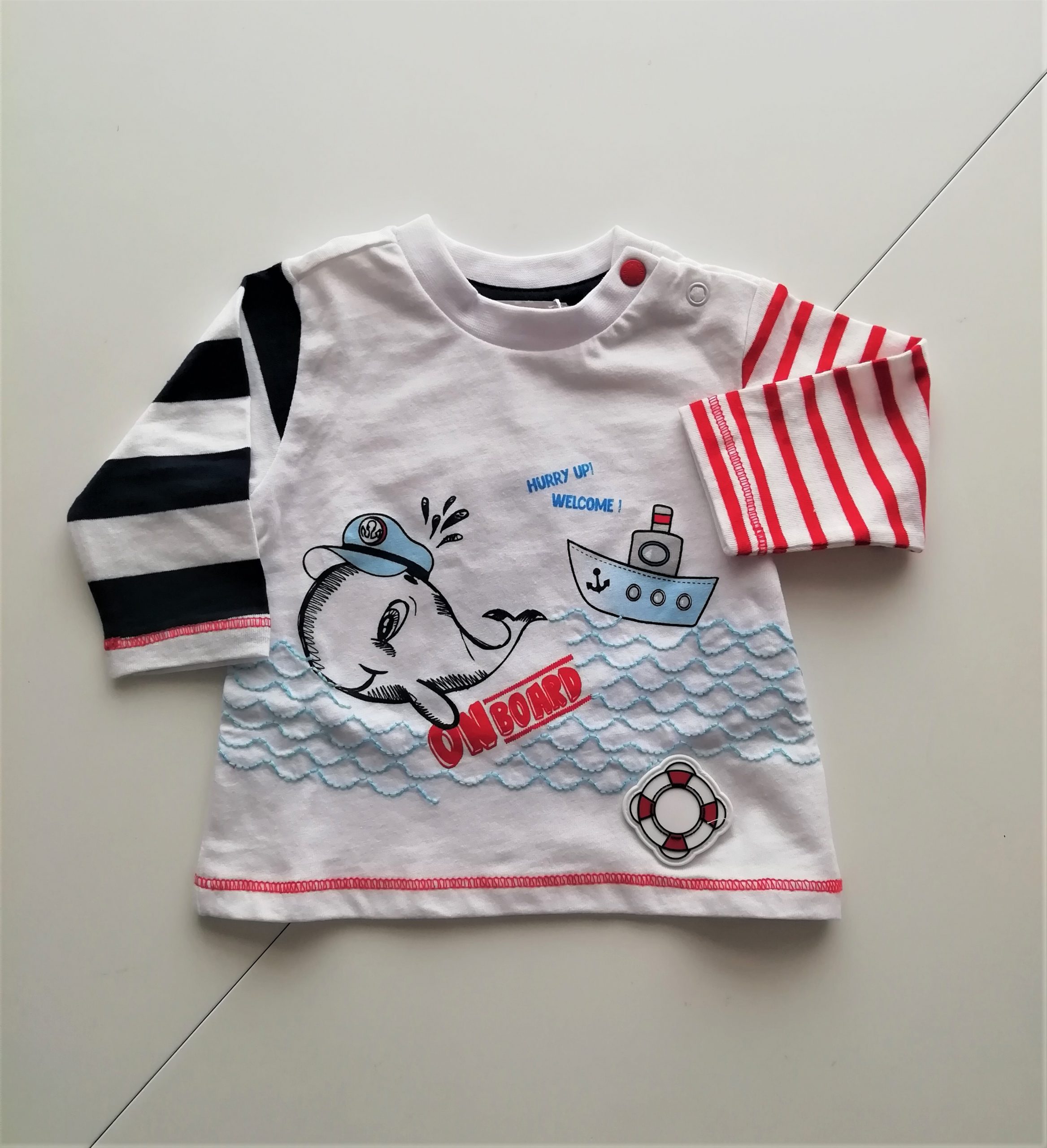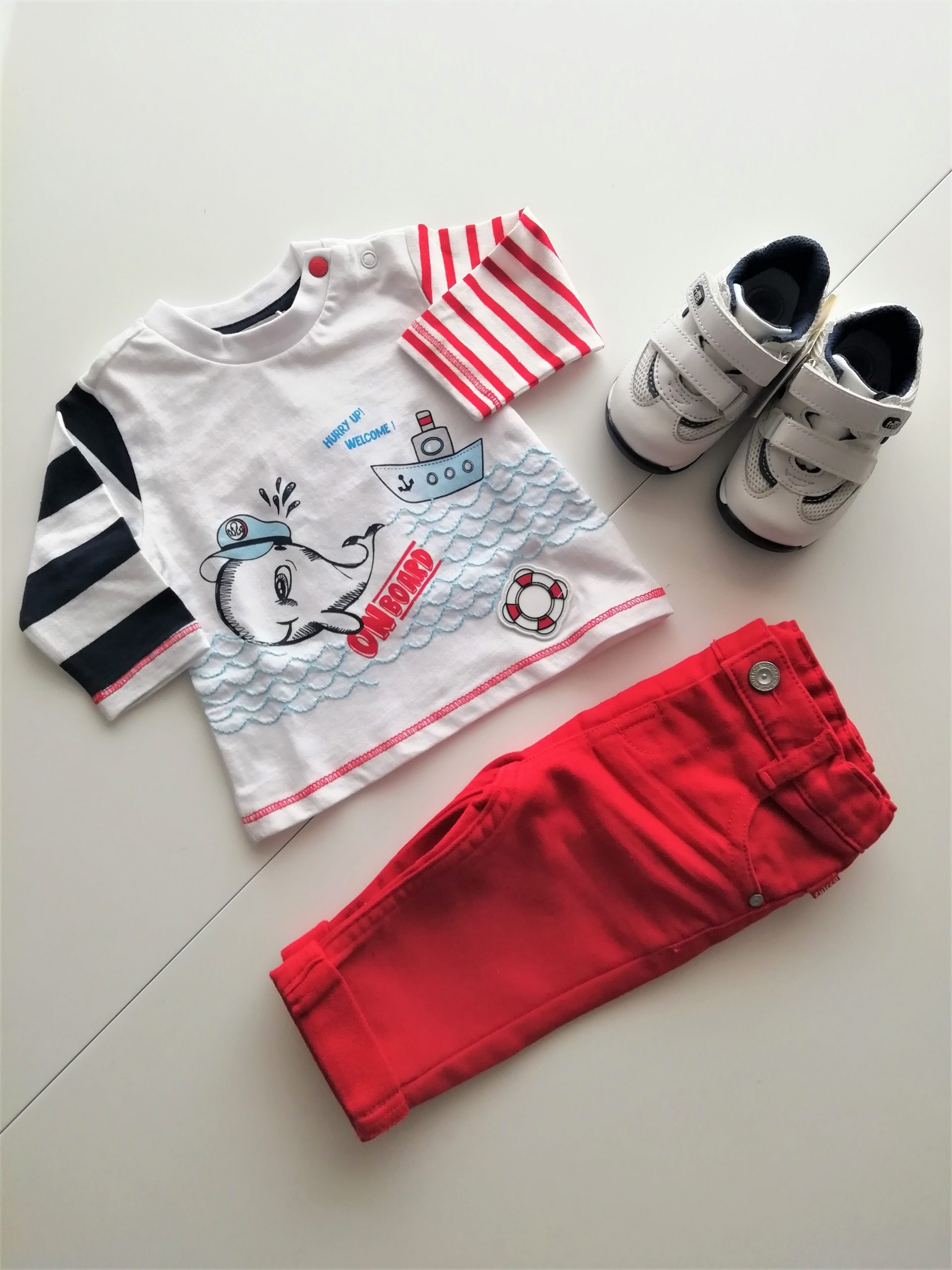 Completo CHICCO, manica lunga, composto da t-shirt girocollo, color bianco,rosso e bluย con bellissima stampa centrale tema balenottera + pantaloncino lungo, color rosso in cotone stretch, elastico regolabile in vita. Classico 5 tasche. Comodo e pratico per un’estate in allegria!!