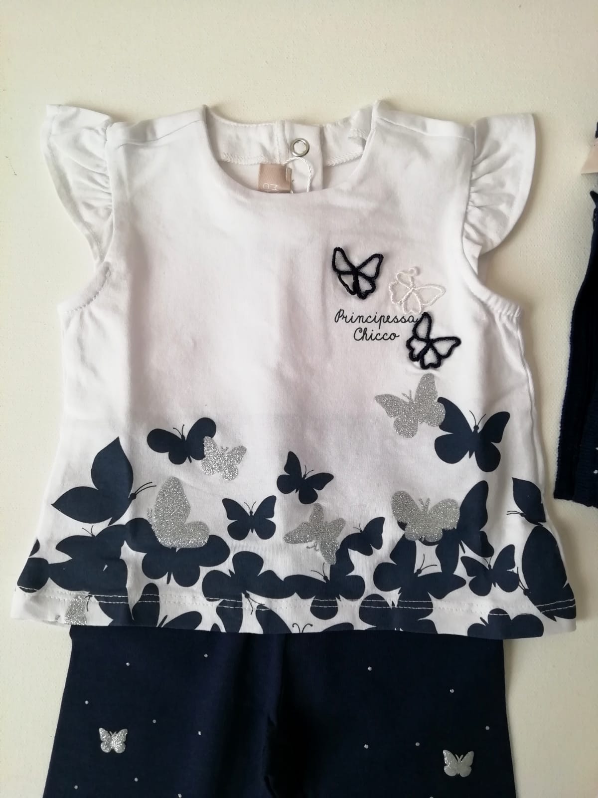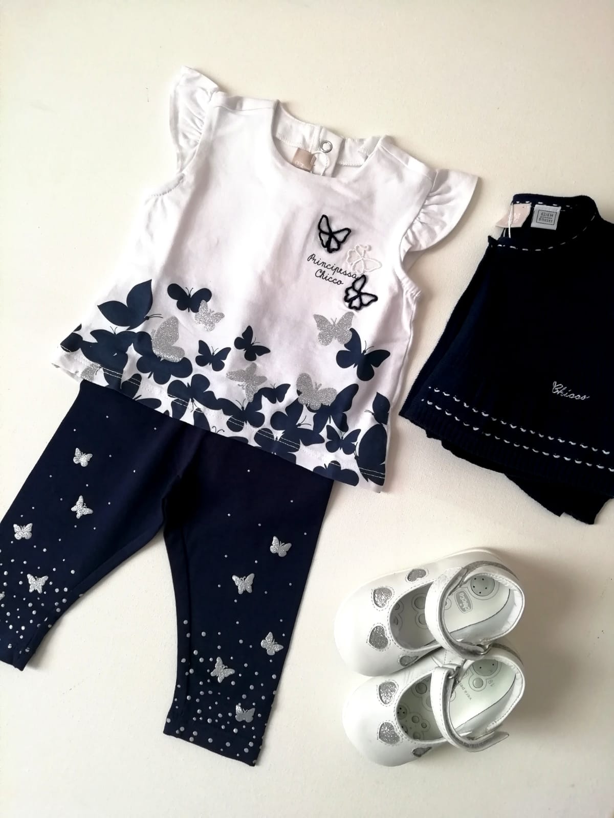 Completino primaverile CHICCO, manica con aletta e modello girocollo. In morbido tessuto di cotone bianco e blu con fantasia farfalle blu e glitter.ย Pantaloncino modello legging color blu con farfalle glitterate all over. Tutto elasticato in vita. Si abbina perfettamente allo scaldacuore blu che vedete in foto e che รจ in vendita separatamente su questo sito.