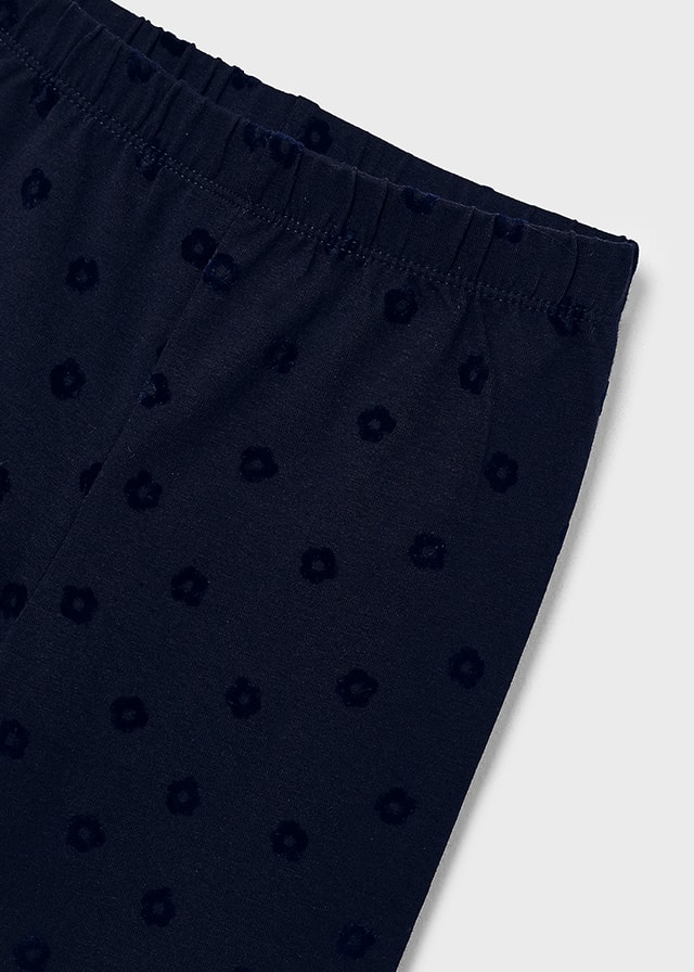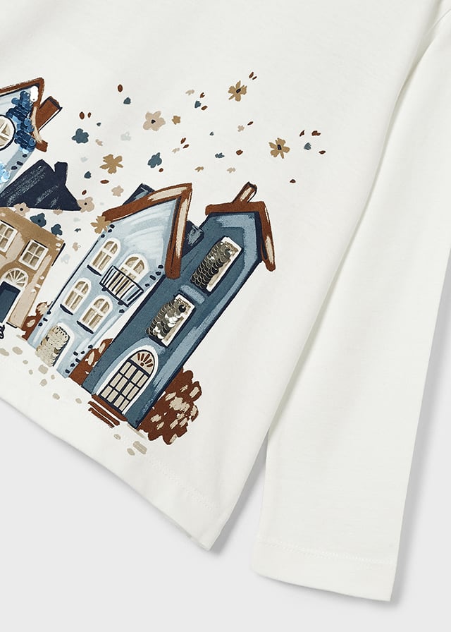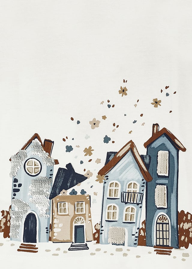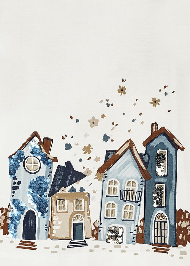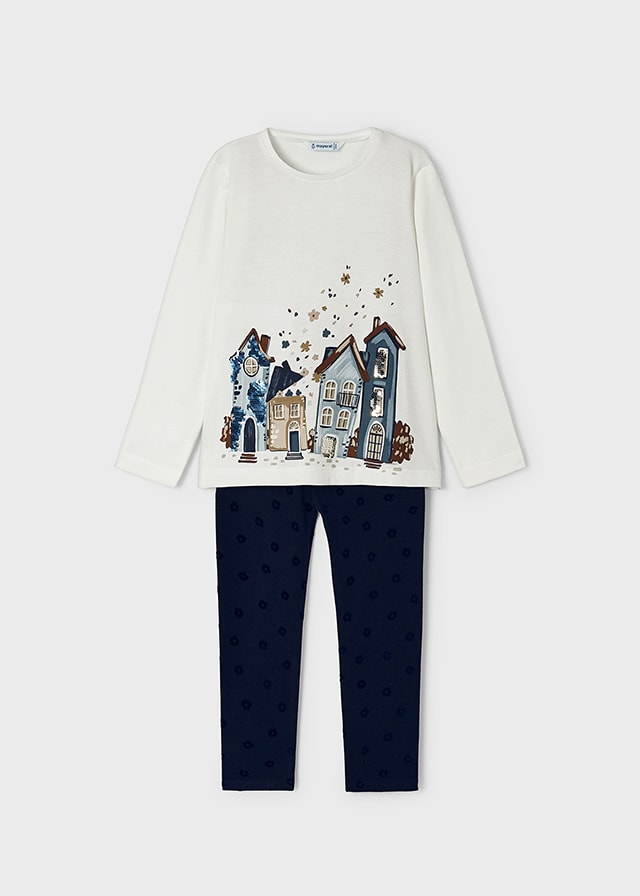 Completo MAYORAL in caldo cotone per bambina, color panna con bellissima stampa centrale con paesaggio, dettagli in paillettes. Modello girocollo, abbinato con legging lungo alla caviglia color blu con fantasia floreale. Tutto elastico in vita.