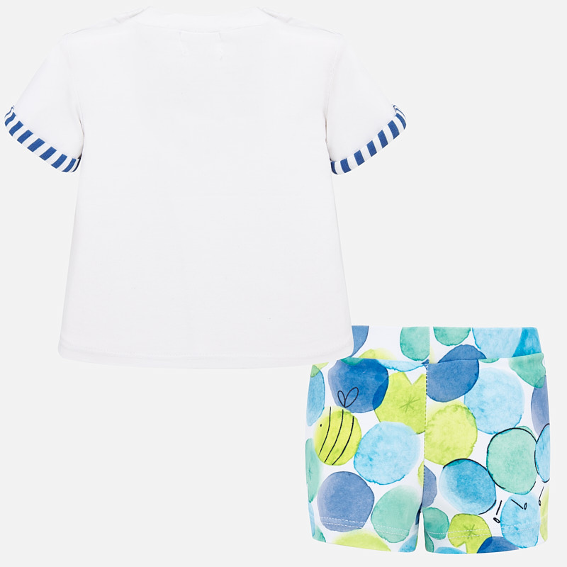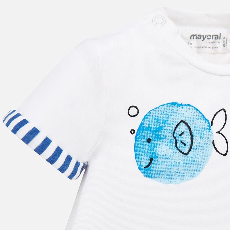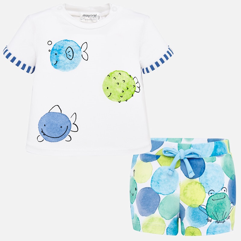 Completo mare MAYORAL per neonato, un must have per le giornate trascorse in spiaggia o in piscina. Morbido tessuto di cotone elasticizzato. Completo composto da t-shirt bianca con stampa centrale pesciolini + boxer mare fantasia pois