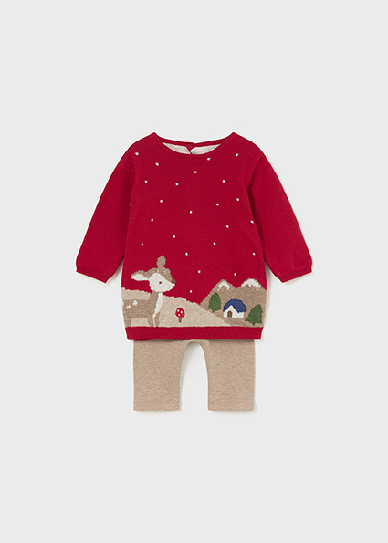 Completo MAYORAL modello girocollo per neonata da 4 mesi a 18 mesi.ย In morbido tricot di caldo cotone invernale.ย Il completo si compone di una maximaglia girocollo color rosso con intarsio disegno di cerbiatta e paesaggio montano. Si abbina a un legging color ecrรน.