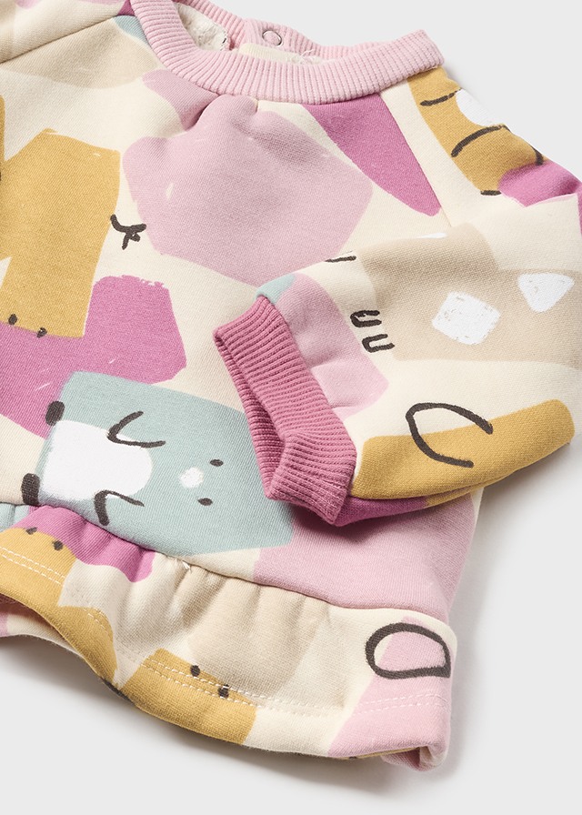 Bellissimo completo MAYORALย invernale, felpato composto da felpa multicolore con polsini rosa. Pantalone stile tuta con elastico in vita, color finto jeans.