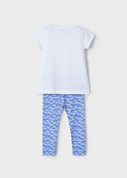 Completo MAYORAL, primaverile/estivo, con pantalone modello legging in color carta da zucchero con fantasia floreale.ย T-shirt abbinata color bianco. Stampa con fantasia floreale.