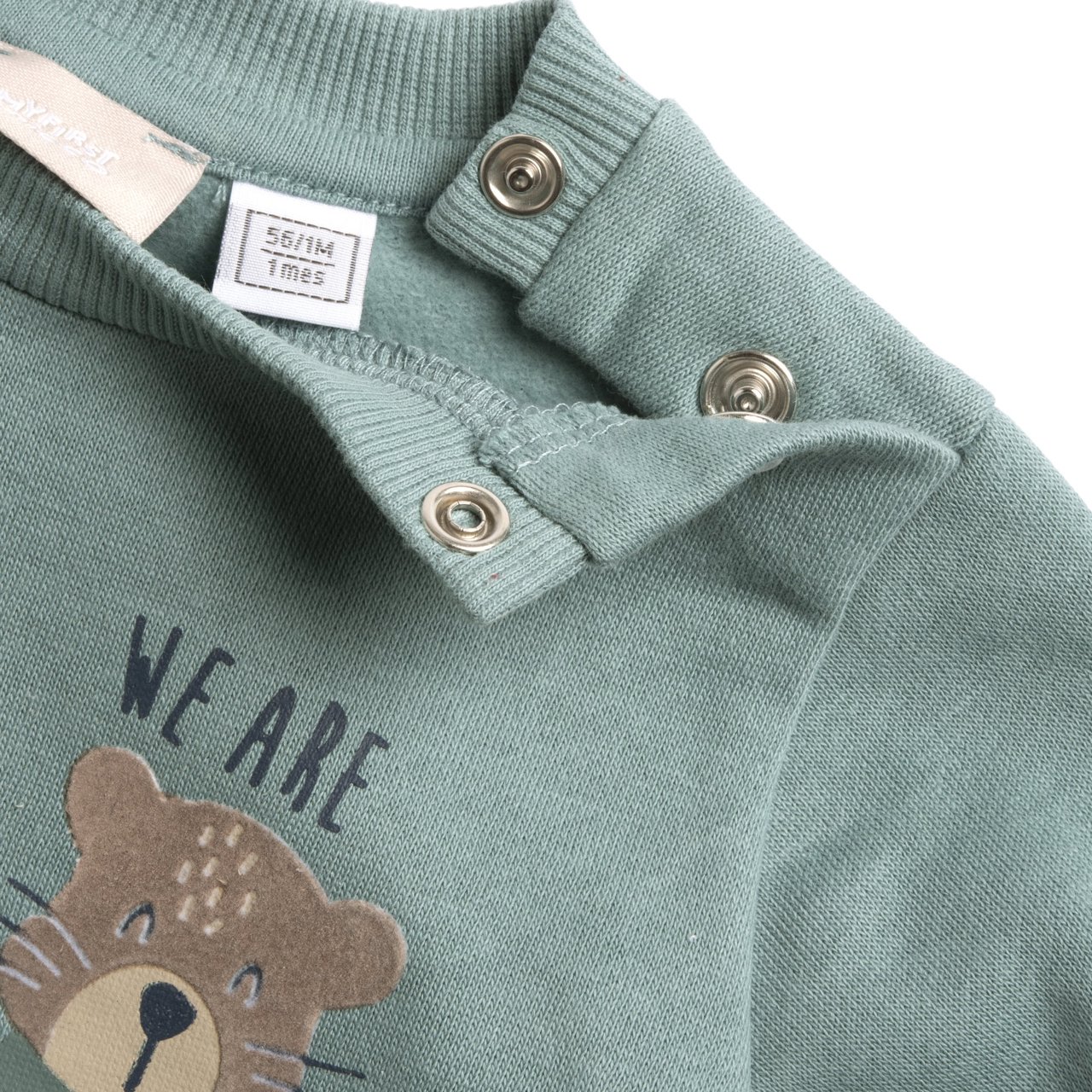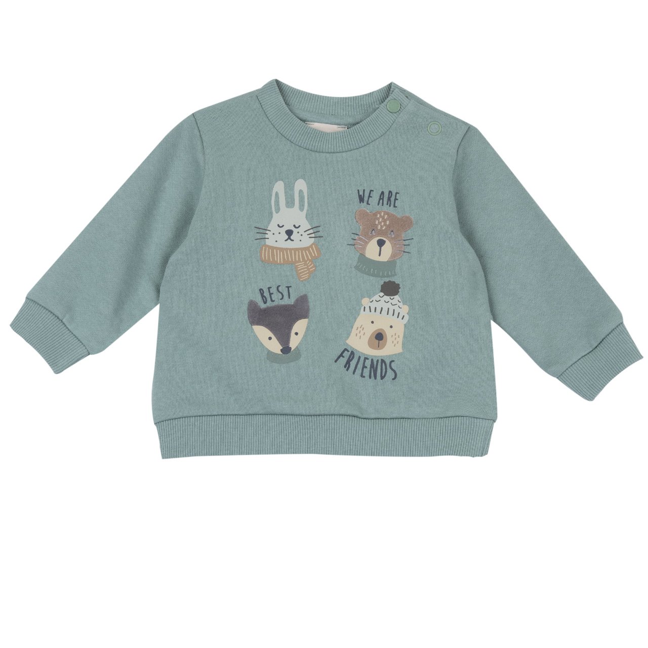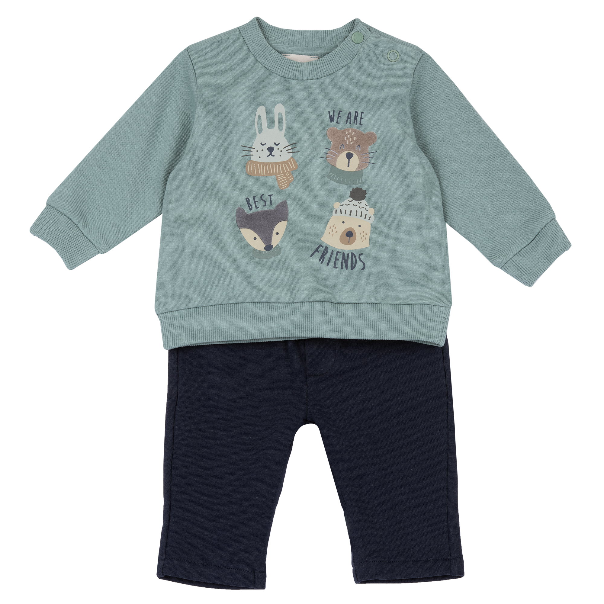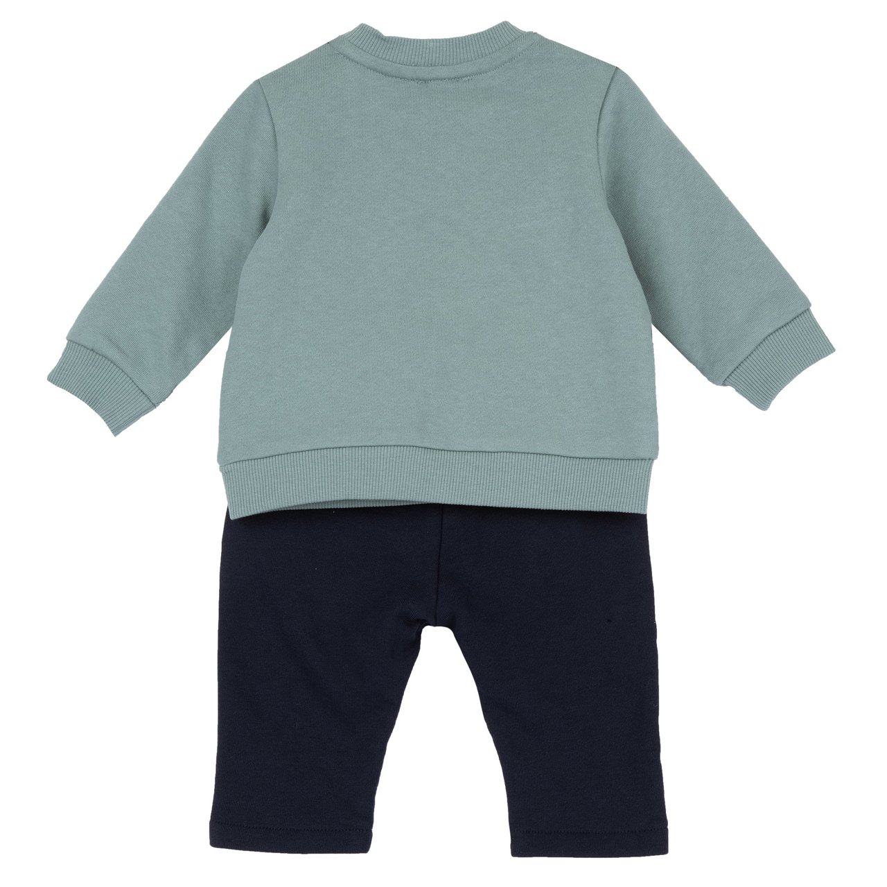 Bellissimo completo tuta CHICCO in felpa invernale per neonato da 6 mesi a 2 anni. Felpa girocollo.ย Color verde salvia con stampa animaletti.ย Pantalone modello tuta color blu con coulisse verde salvia