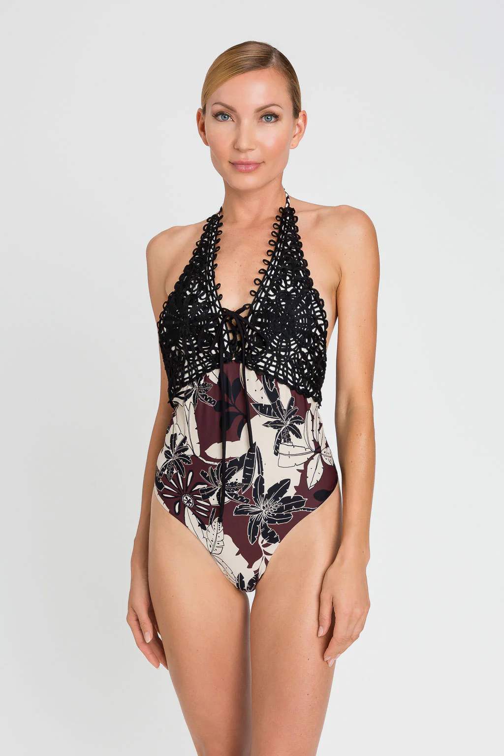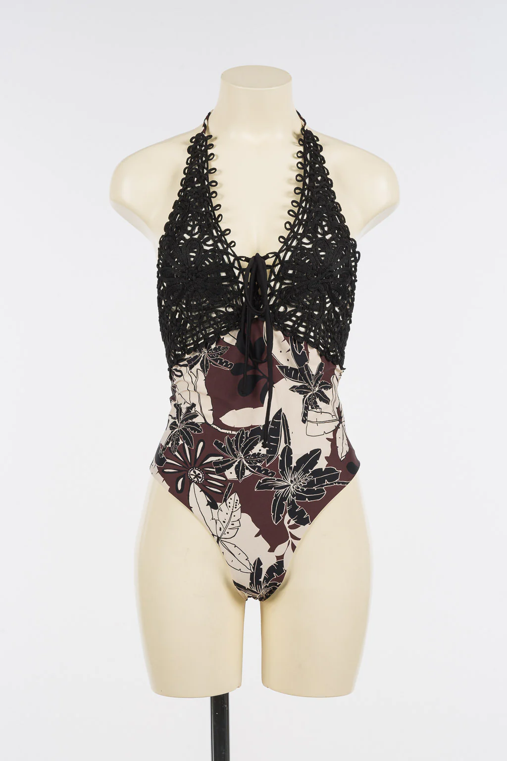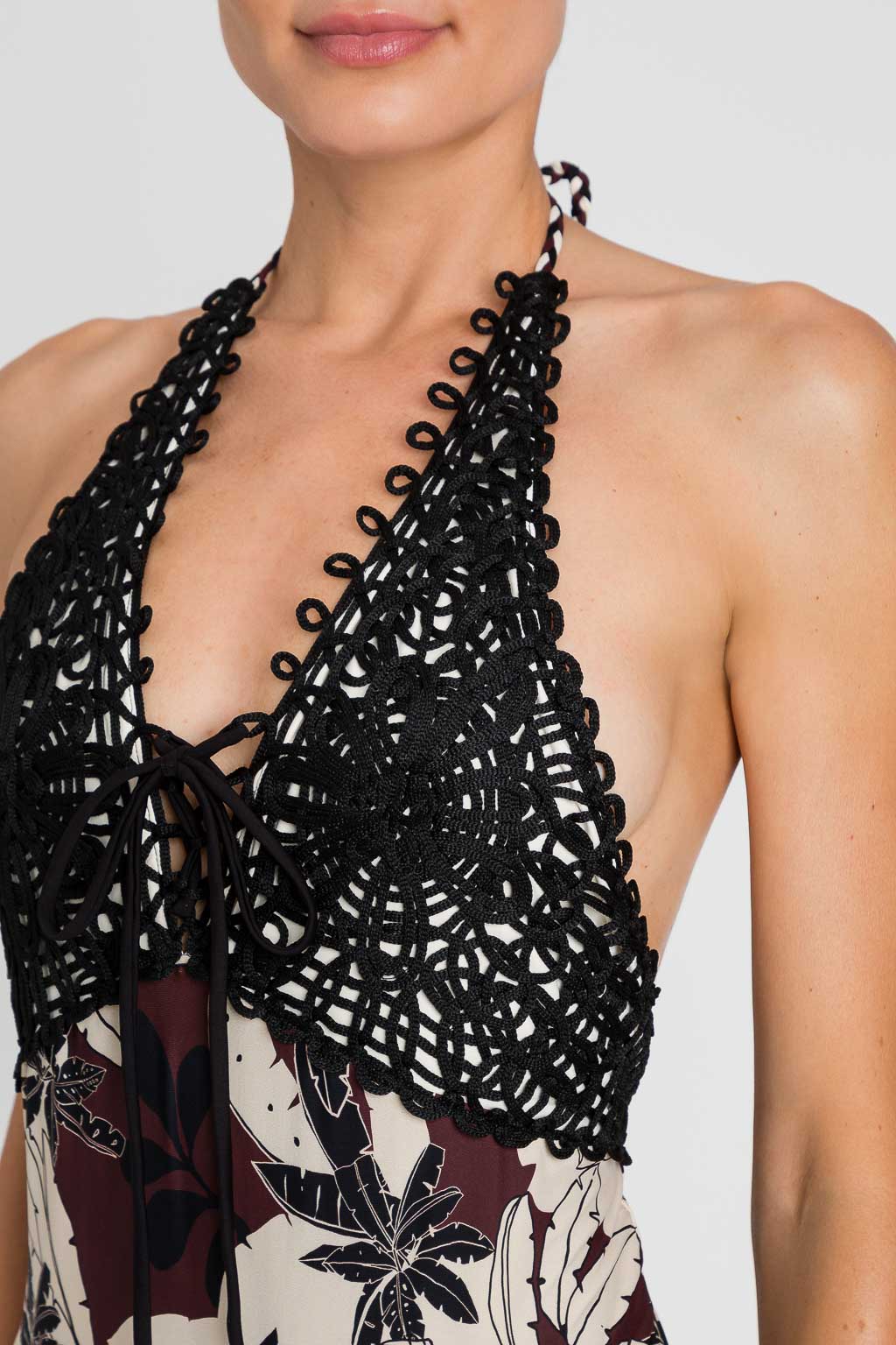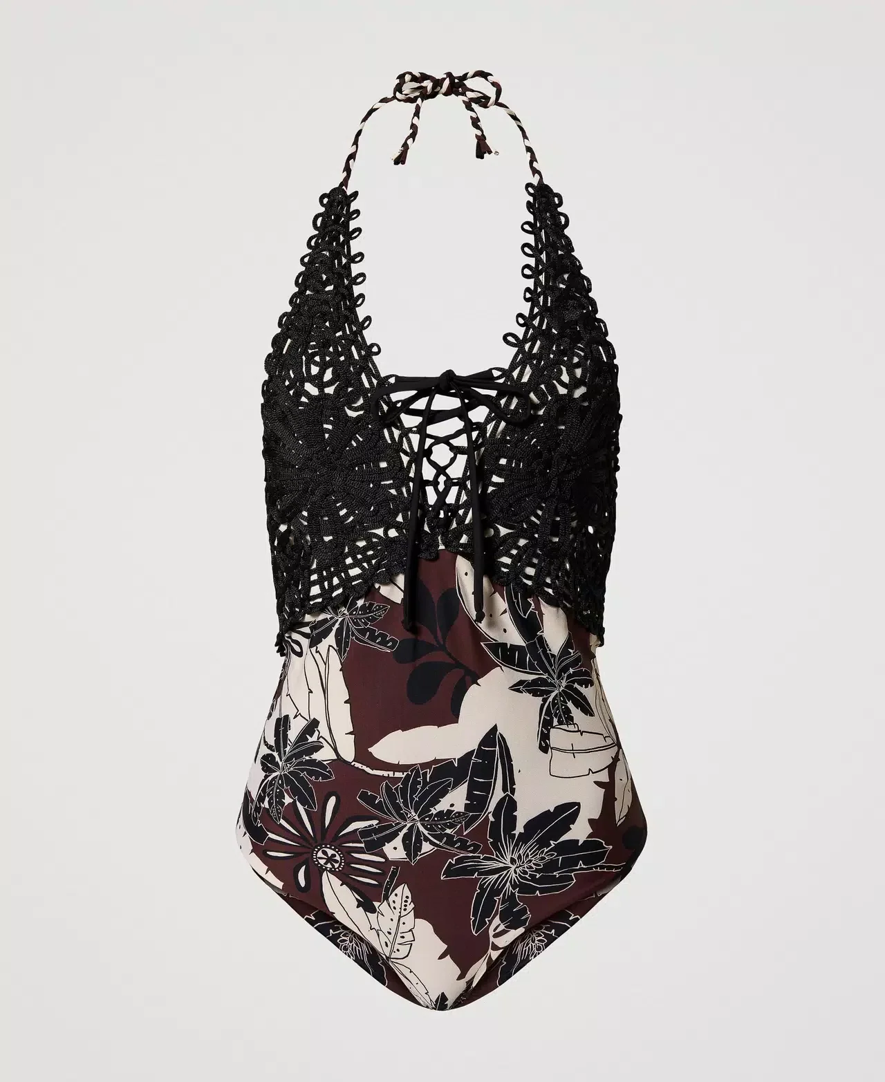 Costume intero con stampa a fiori esotici e ricamo patch crochet, coppe a triangolo a vela, chiusura con lacci a treccia dietro al collo.
