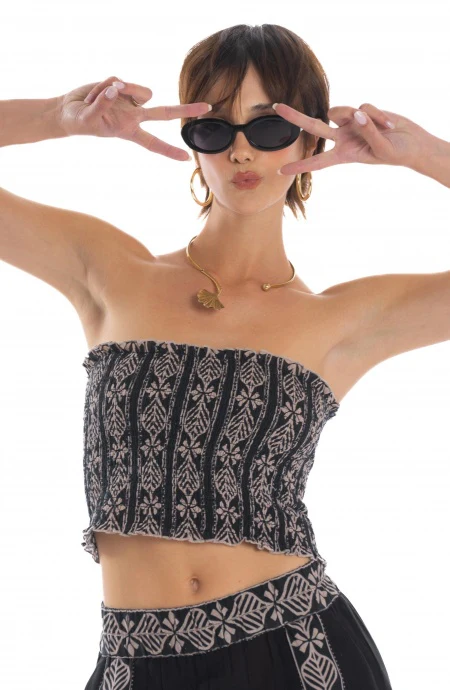 Moderno e divertente il crop top elasticizzato in leggero cotone indiano stampato. Facile da indossare, abbinabile ai pantaloni della stessa serie o shorts di jeans per un look moderno ed estivo.