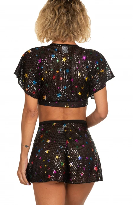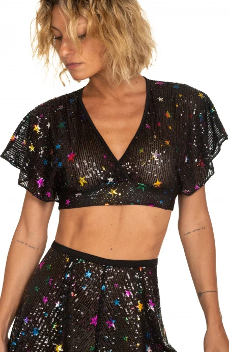 Corto e sbarazzino il tessuto paillettes รจ costellato da stelle laminate multicolor che rendono il capo perfetto in una notte dโestate. Nuance scura accentuata da una banda sul sottoseno in tulle lo rendono comodo e senza segni. Abbinabile al pantalone della serie per un effetto tutina strabiliante.