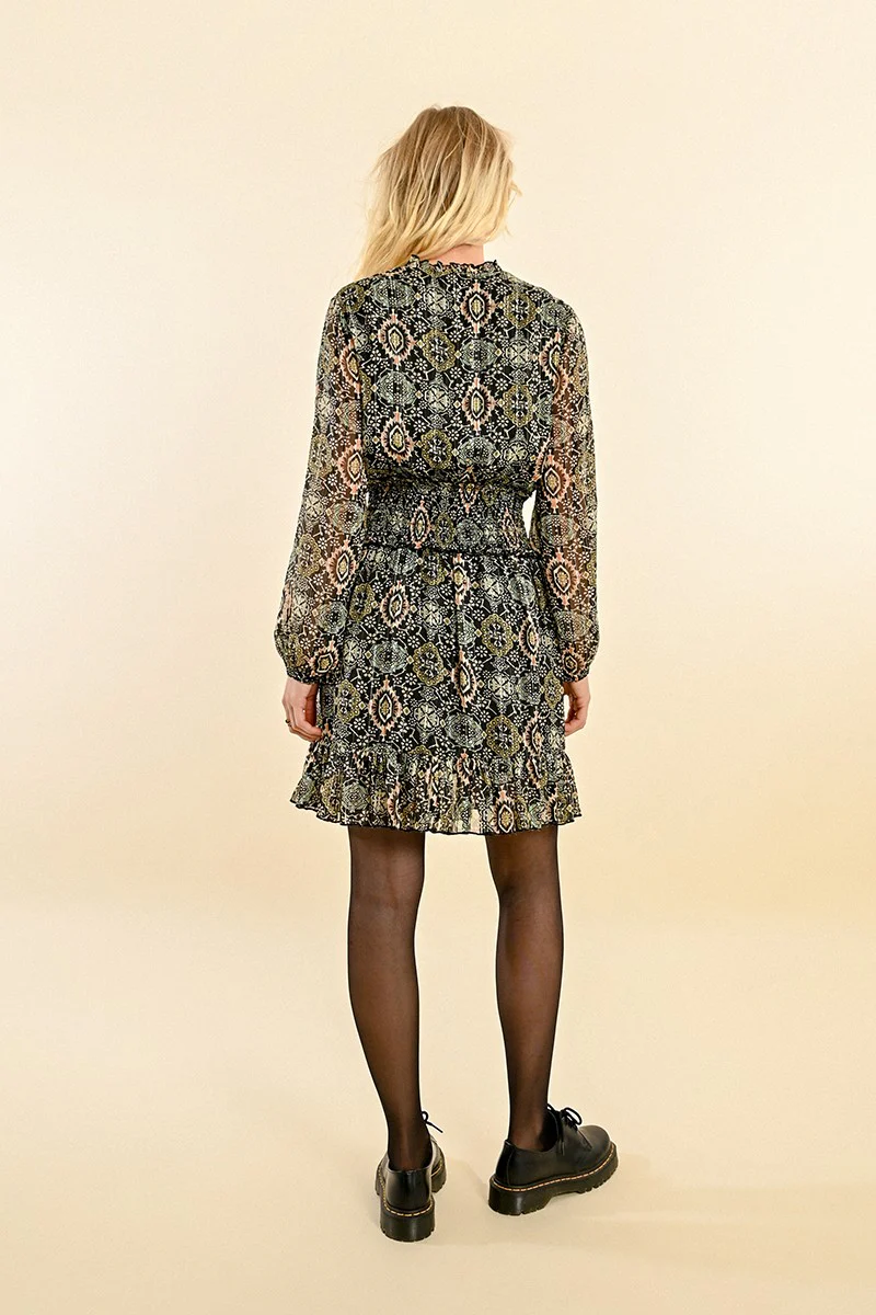 molly braken donna abito Z528CH green anjali -Abito corto in voile stampato-Maniche lunghe trasparenti-Polsini elasticizzati-Colletto alto arricciato, impreziosito da un fiocco-Ampia apertura sullo scollo-Vita ampia e segnata, finitura arricciata-Fondo della gonna plissettato-Parzialmente foderato-Lunghezza dalla spalla 94 cm (per una taglia S)