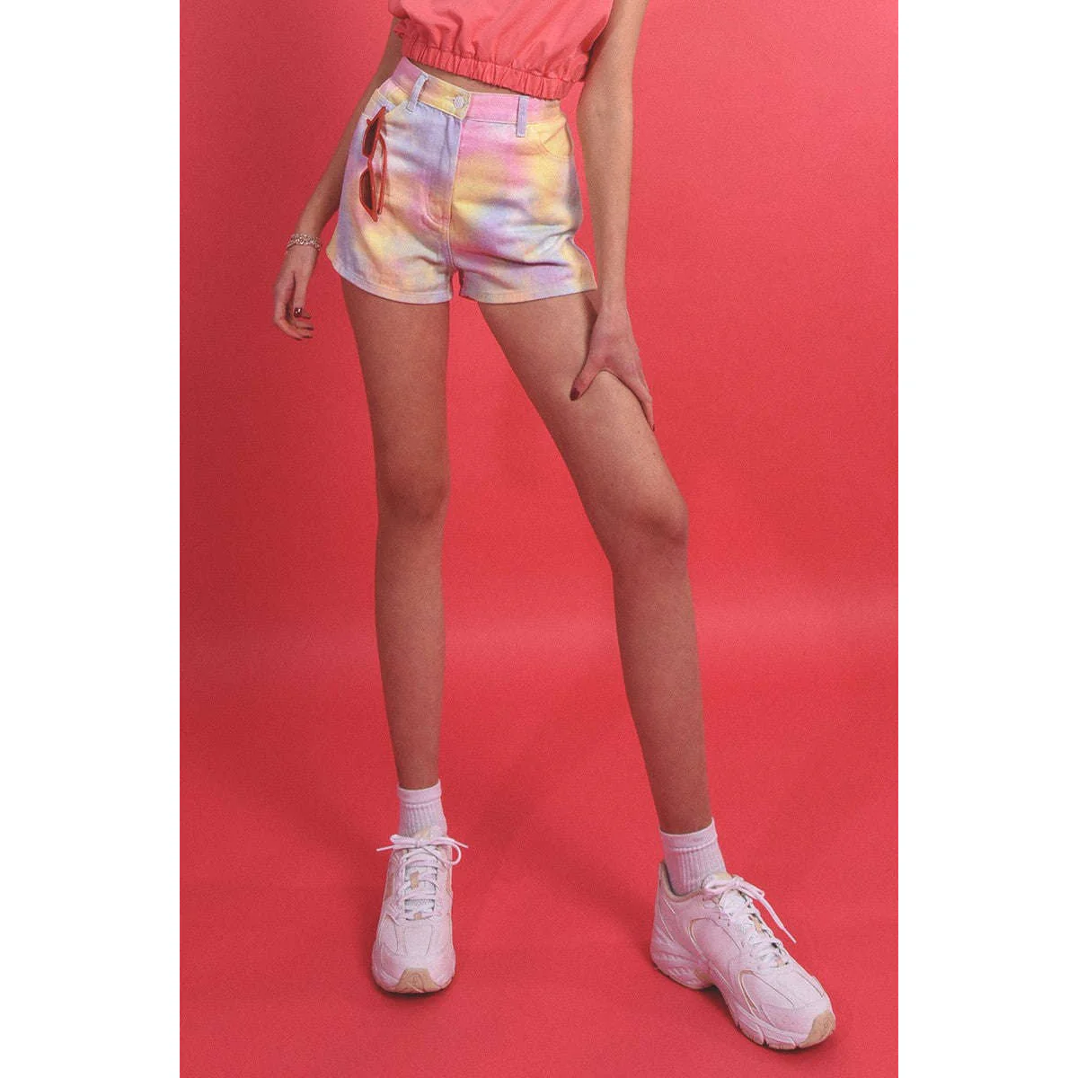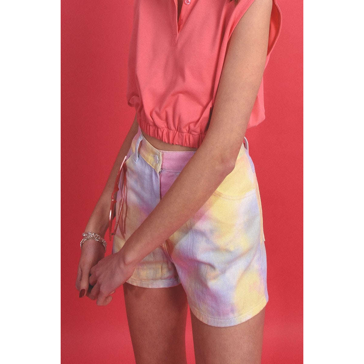 Shorts stile denim con 5 tasche, fantasia arcobaleno, vita alta Lunghezza: 33cm Taglia S