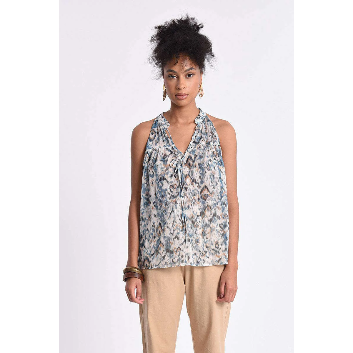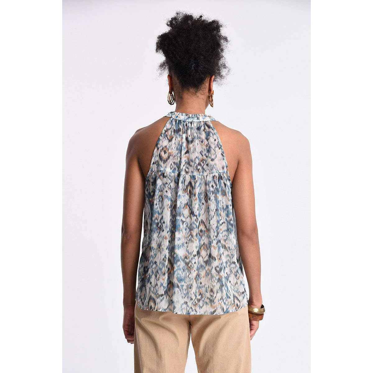 Top giromanica americano, collo annodato, stampa blu allover