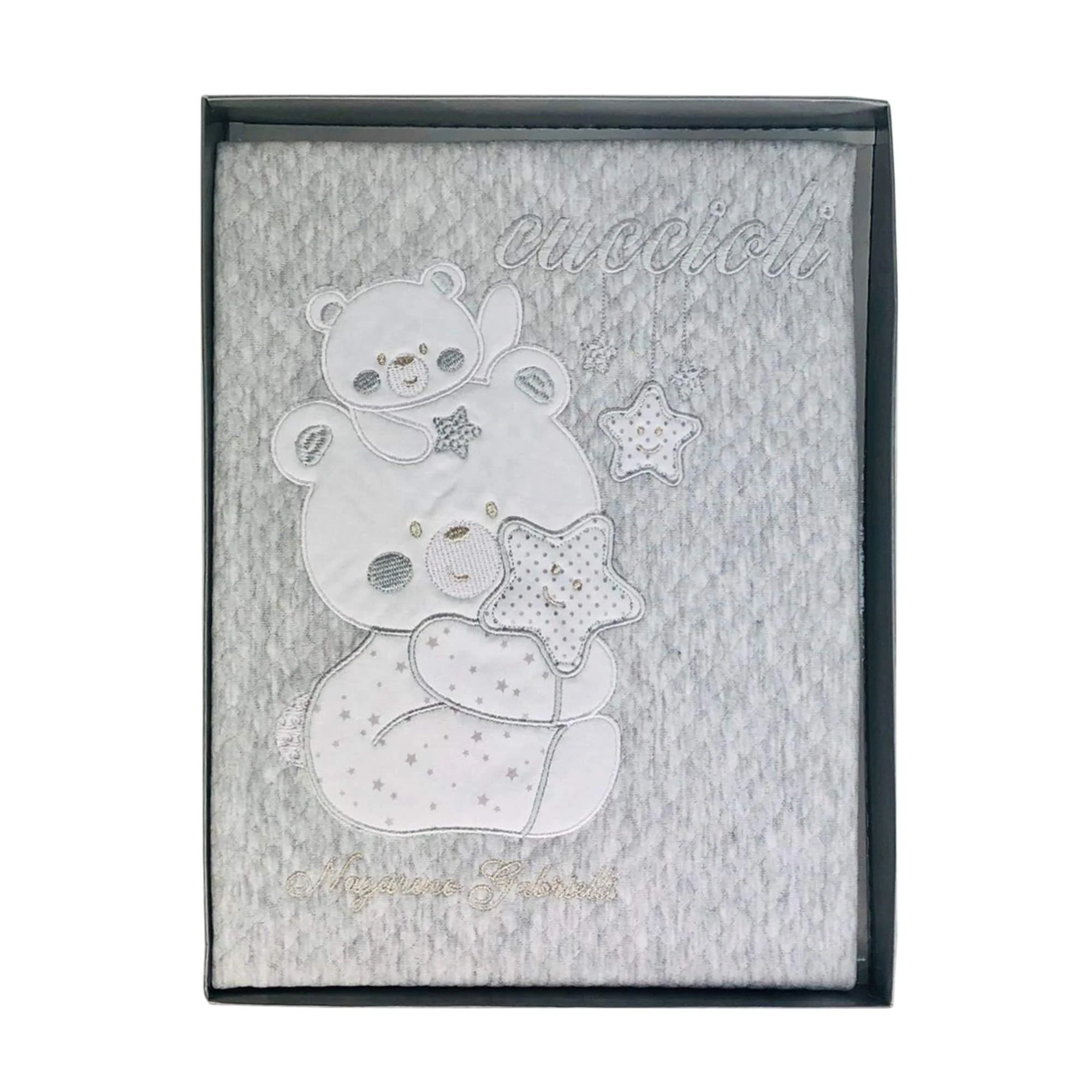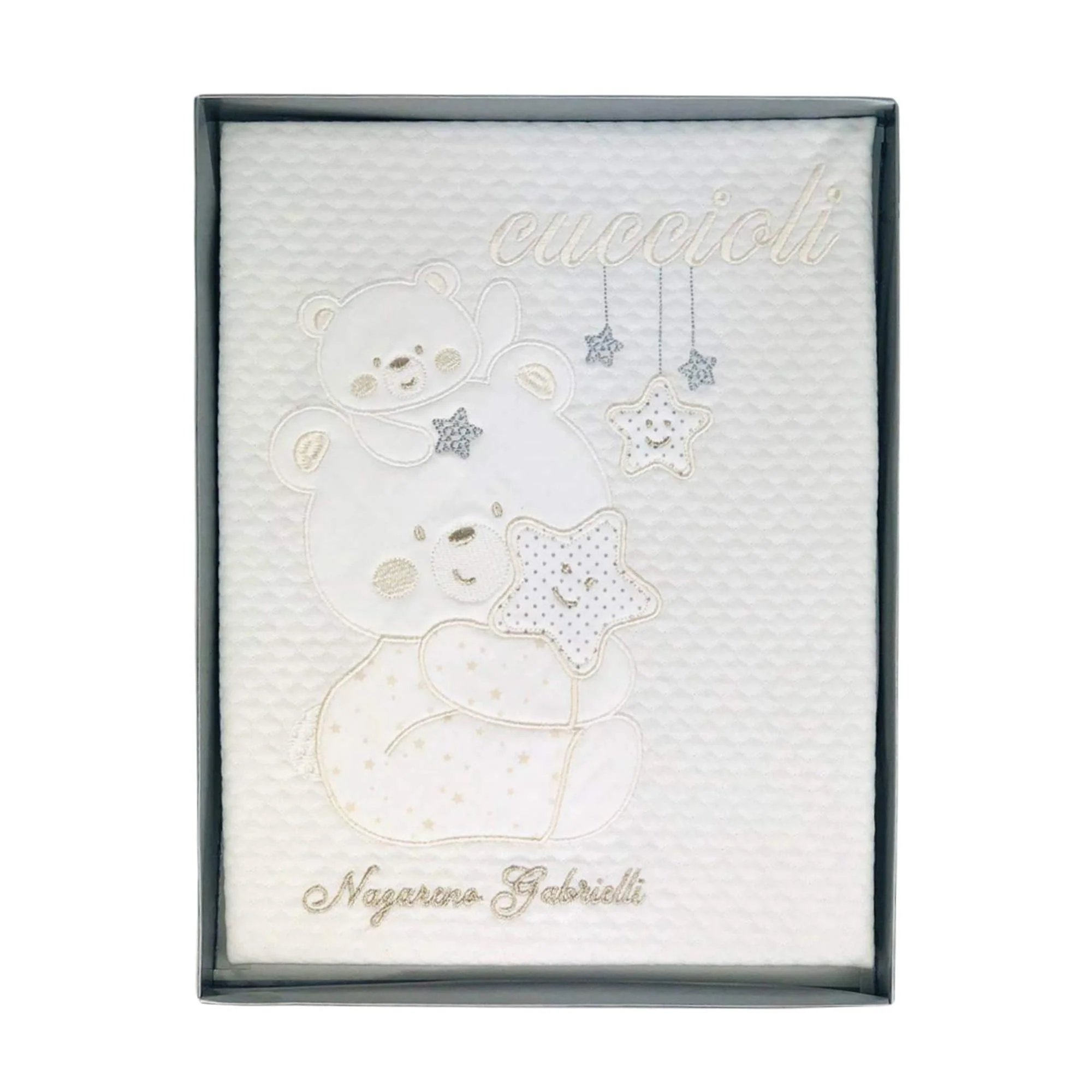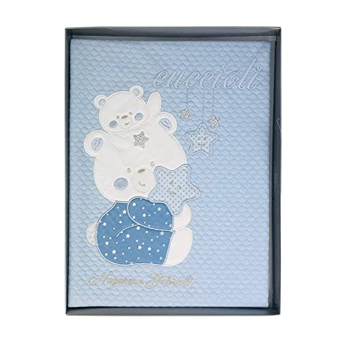 - Ricamo Orsacchiotto: Il delicato ricamo di un orsacchiotto aggiunge un tocco di dolcezza e fantasia alla copertina, rendendola un regalo perfetto per neonati.