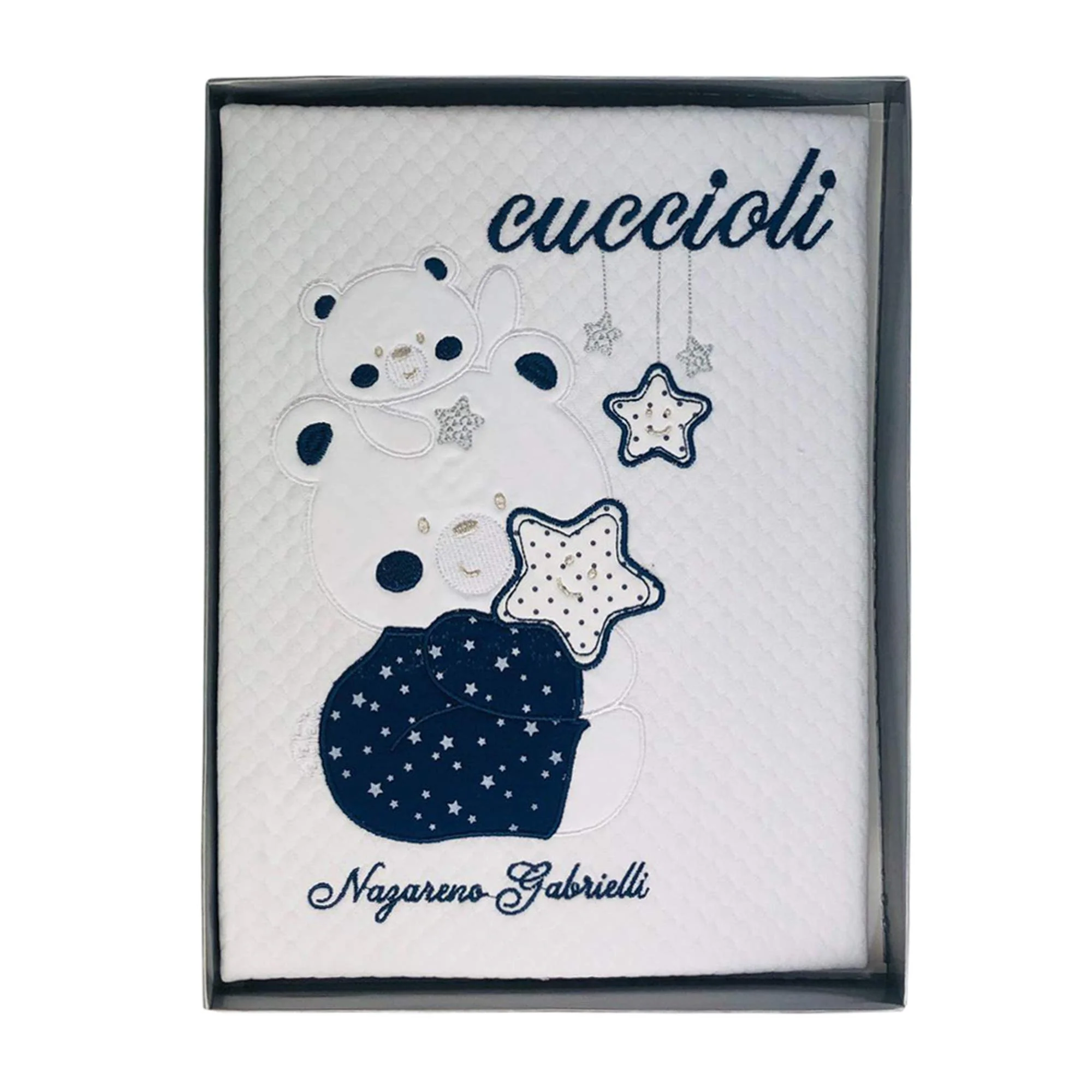 Avvolgi il tuo piccolo nel comfort e nella morbidezza della copertina neonato NAZARENO GABRIELLI. Realizzata con cura e attenzione ai dettagli, questa copertina รจ perfetta per culla o carrozzina, garantendo un riposo tranquillo e rilassante al tuo neonato. Il dolce ricamo di un orsacchiotto aggiunge un tocco di dolcezza e tenerezza a questo accessorio indispensabile.