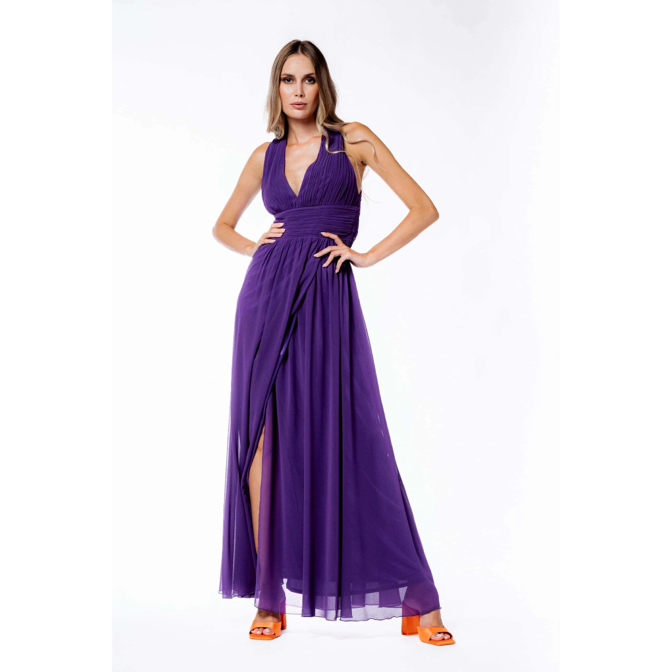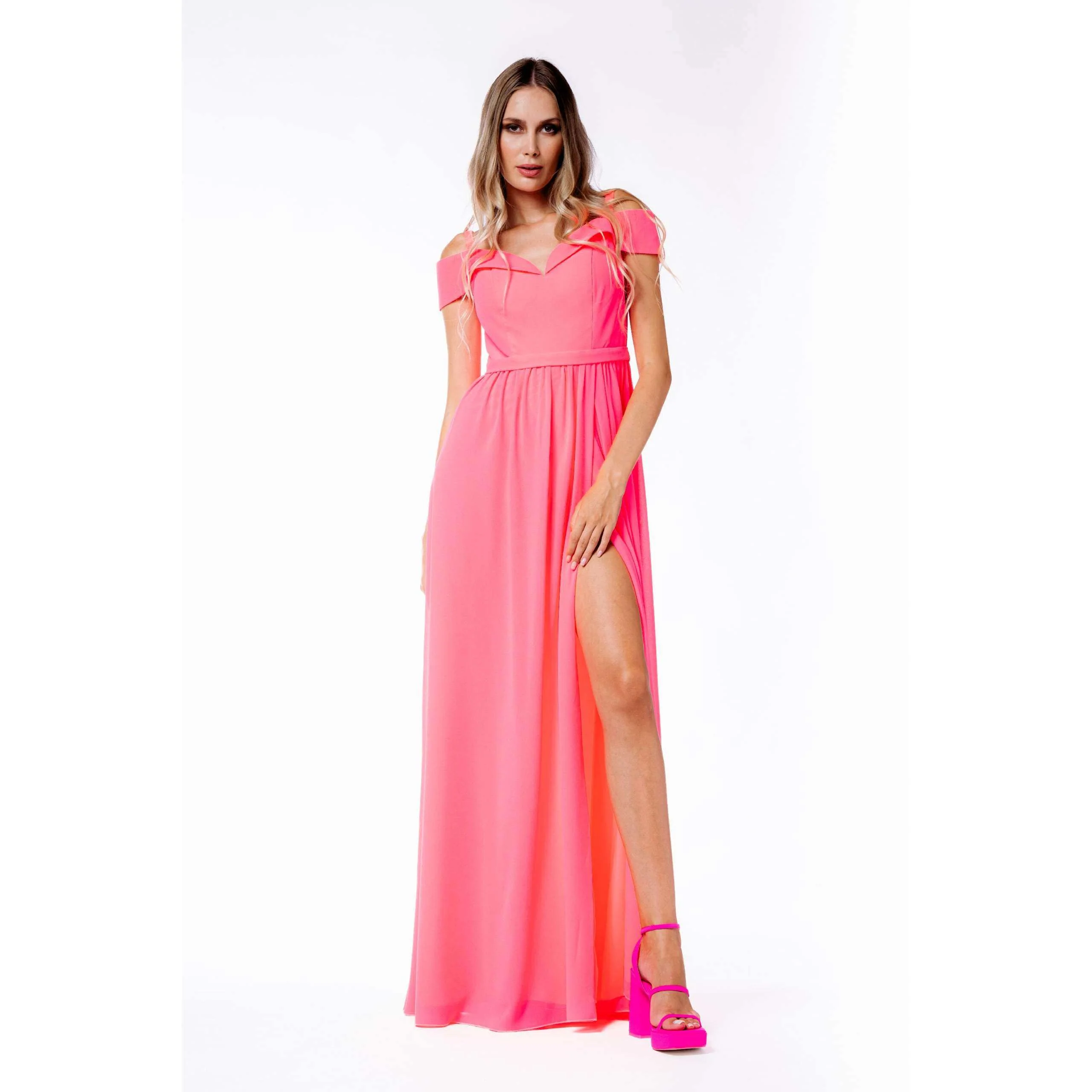 Abito ROSA “BUBBLE” come nella terza foto, Crรชpe, senza applicazioni, tinta unita, collo con scollatura profonda, plissรจ, senza maniche con Spalline Larghe , interno foderato, zip, senza tasche, modello stile impero con spacco centrale e intreccio sulla schiena