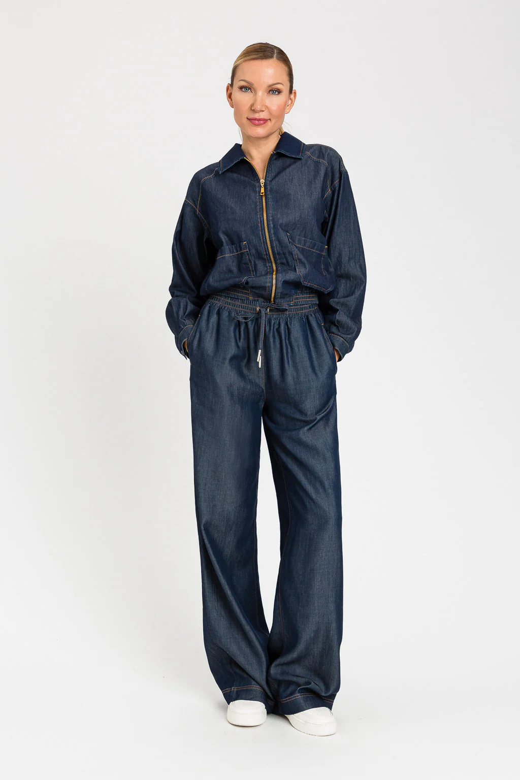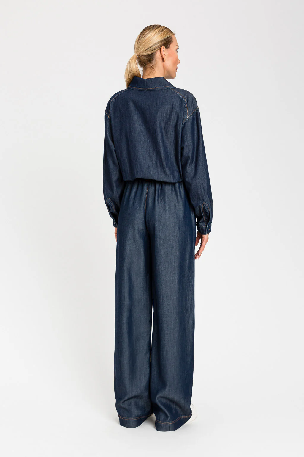 Pantaloni in chambray con elastico in vita e coulisse con terminali in metallo, tasche alla francese, cuciture ribattute con filo color tabacco, logo a cuore in metallo sul retro, linea ampia. Codice prodotto: 261LL2QGG Denim Scuro Linea ampia Altezza modella: 178 cm. Taglia indossata: XS/40 100% lyocell. Materiale 2: 100% lyocell Lavare delicatamente max 30ยฐC, […]