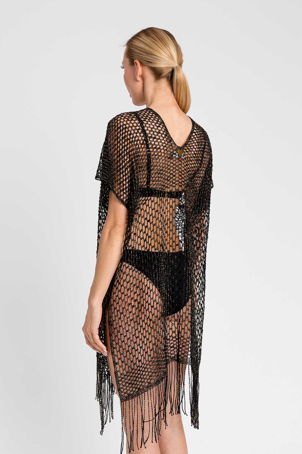 Poncho made in Italy in rete lurex con scollatura a V, maniche corte a kimono, frange al fondo, logo a cuore sul retro.
