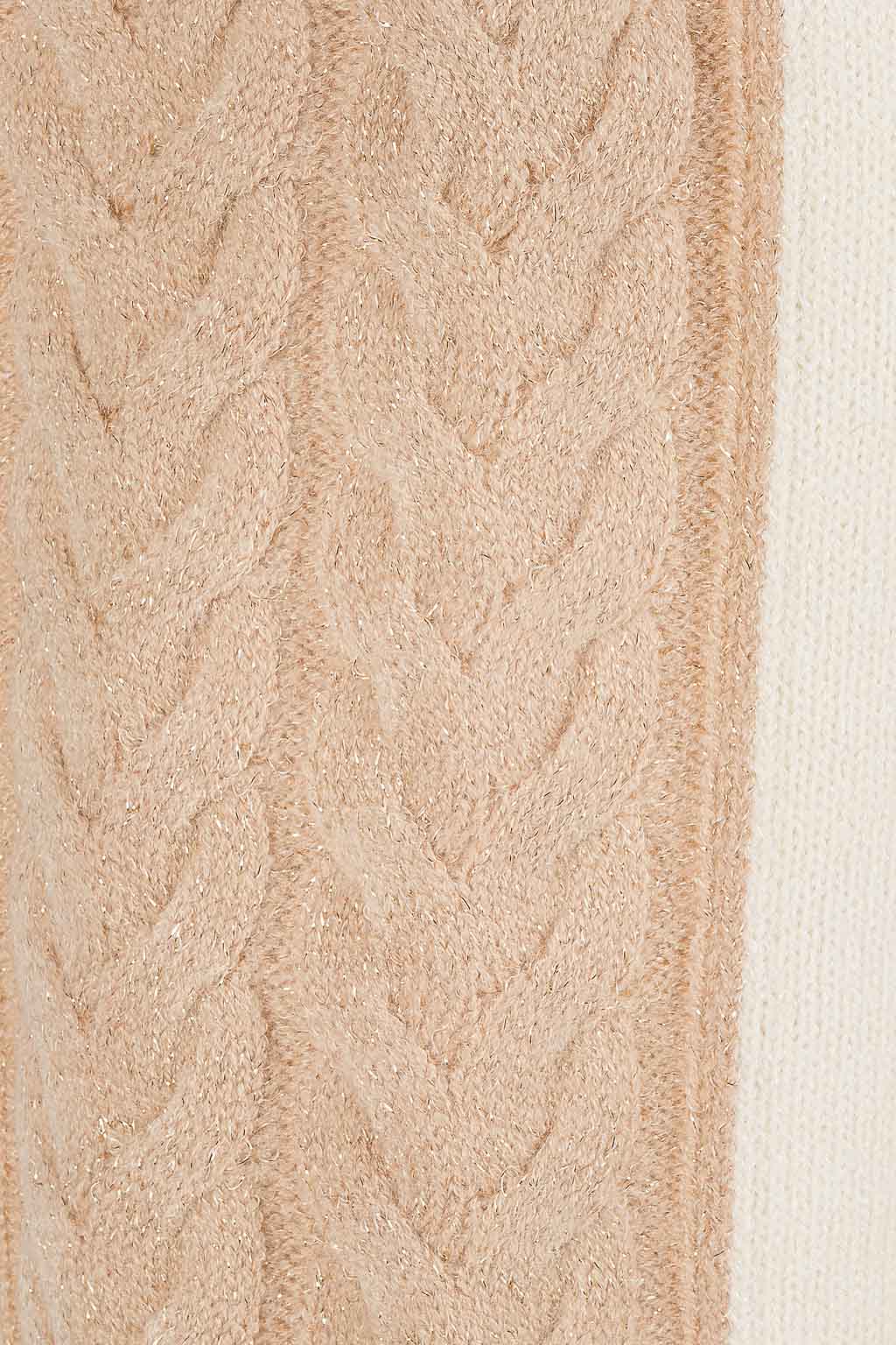 Sciarpa in maglia lavorata a trecce con frange al fondo e placchetta logo ottone chiaro. Codice prodotto: 242LL5AHH Panna Madreperla-Beige Nero 35×190 cm 92% poliestere 8% lana Lavare a mano, Non trattare con cloro, Non usare asciugatrice, Non lavare a secco