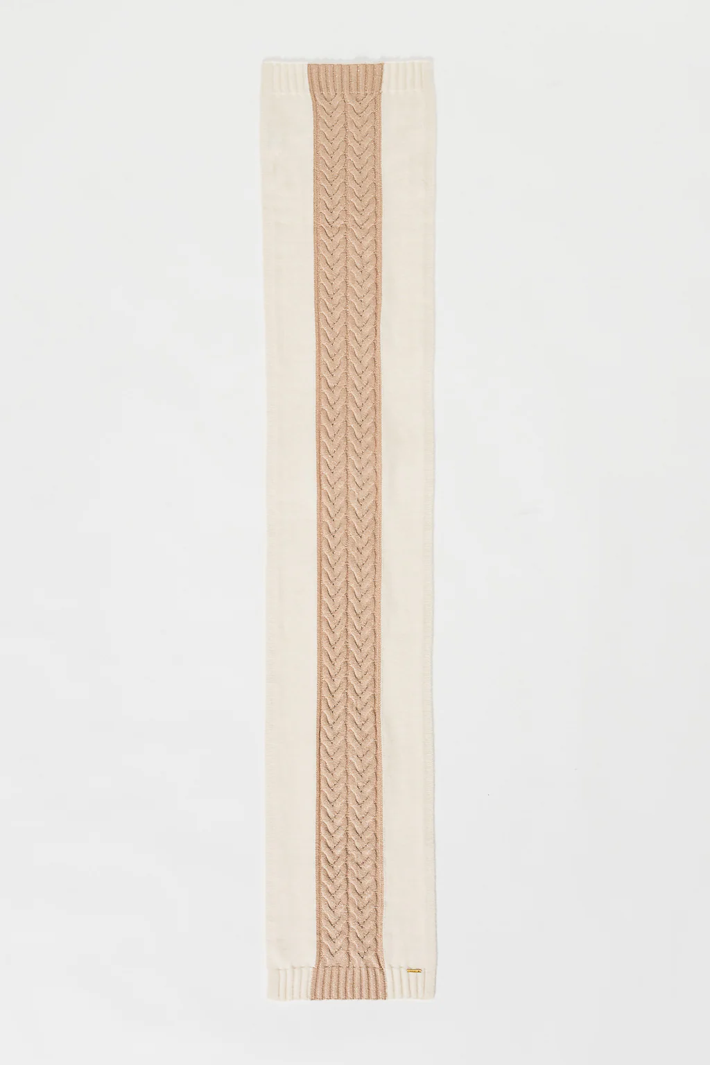 Sciarpa in maglia lavorata a trecce con frange al fondo e placchetta logo ottone chiaro.