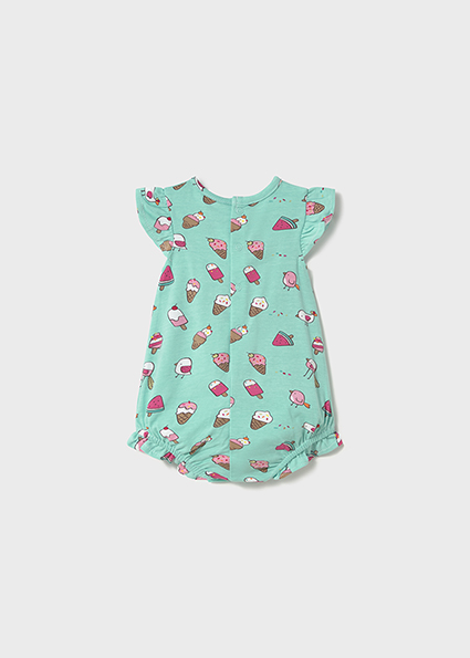 Set tre tutine corte estive MAYORAL, in in jersey di cotone leggero, smanicate e con volant sulle spalle. Modello girocollo tutte con apertura entrogamba.ย Color base per tutte turchese con design uccellini.